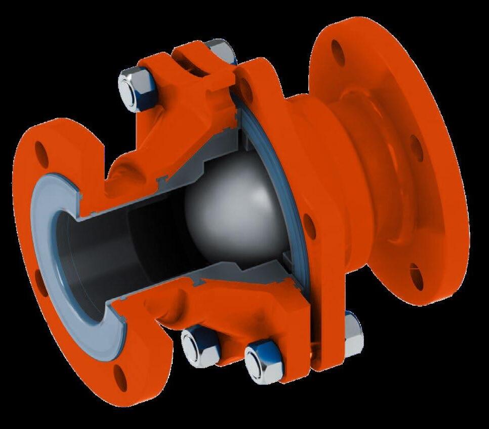 The Uniflo ball check valves are developed for use on fluids compatible with the corrosion resistant characteristics of virgin PFA. These valves can be used in horizontal and vertical installations. The body of the valve is made from a combination of ductile iron and steel. The body parts do not come into contact with the process flow.