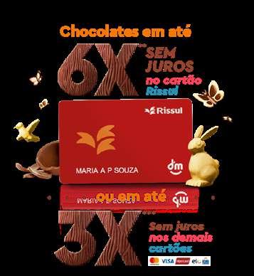 **Parcela mínima de R$ 30,00 (trinta reais). Condição de 6x válida apenas para compras de chocolates com o Cartão Rissul, no período de 09/03 a 09/04/2023. ***Parcela mínima de R$ 30,00 (trinta reais).