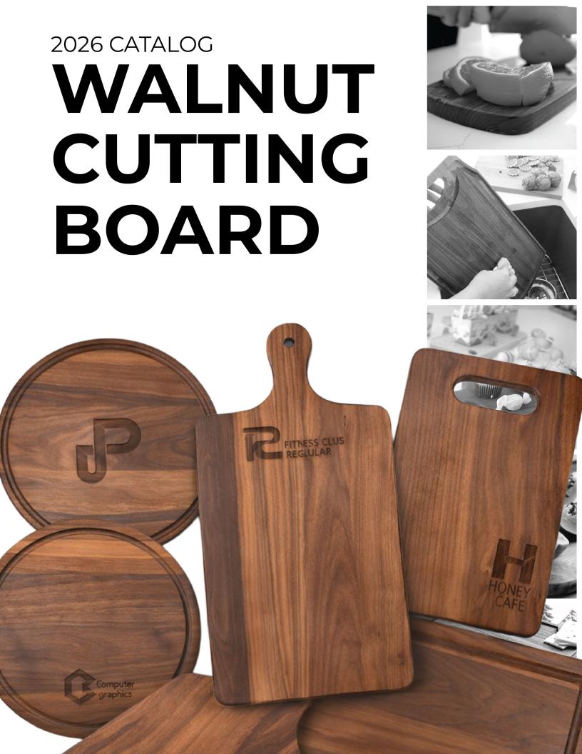 This natural 9" x 12" rectangular walnut cutting board makes an impeccable cutting board that doubles as a gorgeous serving board. This product is laser engrav…