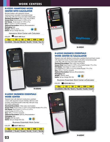 H-62242 BUSINESS ESSENTIALS WORK CENTER W/CALCULATOR Textured vinyl with stitched construction, padded front and back covers with zippered closure. Dual-powered calculator, horizontal pocket under flap with pen loop and ruled writing pad. Standard Decoration: One color, one location. Screen Print: Front Cover: 5 1/2"h x 4"w, Inside Pocket: 1"h x 3"w. Foil Stamp: Front (Top): 2 1/2"h x 5 3/4"w Front (Bottom): 5 1/8"h x 5 3/4"w, Inside Pocket: 1"h x 3"w. Size: 10"h x 7 3/4"w (closed). Optional Decoration: Deboss, Personalization. Packaging: Bulk. Weight: 1.00 lbs. each. Extras: Set up charge $55 (G).