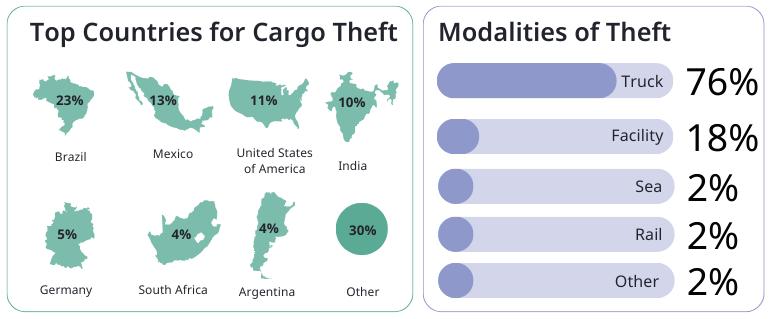 • 76% involved trucks, including 21% hijackings and 20% theft of vehicles