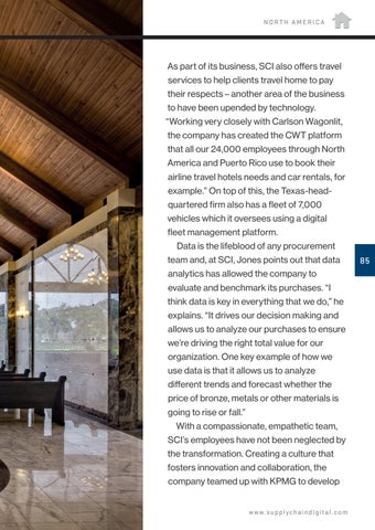As part of its business, SCI also offers travel services to help clients travel home to pay their respects – another area of the business to have been upended by technology. “Working very closely with Carlson Wagonlit, the company has created the CWT platform that all our 24,000 employees through North America and Puerto Rico use to book their airline travel hotels needs and car rentals, for example.” On top of this, the Texas-headquartered firm also has a fleet of 7,000 vehicles which it oversees using a digital fleet management platform. Data is the lifeblood of any procurement team and, at SCI, Jones points out that data analytics has allowed the company to evaluate and benchmark its purchases. “I think data is key in everything that we do,” he explains. “It drives our decision making and allows us to analyze our purchases to ensure we’re driving the right total value for our organization. One key example of how we use data is that it allows us to analyze different trends and forecast whether the price of bronze, metals or other materials is going to rise or fall.” With a compassionate, empathetic team, SCI’s employees have not been neglected by the transformation. Creating a culture that fosters innovation and collaboration, the company teamed up with KPMG to develop w w w.suppl yc ha i ndi gi ta l. com