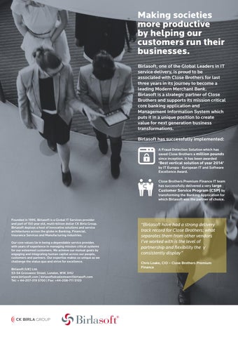 Making societies more productive by helping our customers run their businesses. Birlasoft, one of the Global Leaders in IT service delivery, is proud to be associated with Close Brothers for last three years in its journey to become a leading Modern Merchant Bank. Birlasoft is a strategic partner of Close Brothers and supports its mission critical core banking application and Management Information System which puts it in a unique position to create value for next generation business transformations. Birlasoft has successfully implemented: A Fraud Detection Solution which has saved Close Brothers a million pounds since inception. It has been awarded