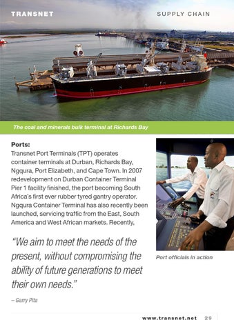 Ports: Transnet Port Terminals (TPT) operates container terminals at Durban, Richards Bay, Ngqura, Port Elizabeth, and Cape Town. In 2007 redevelopment on Durban Container Terminal Pier 1 facility finished, the port becoming South Africa’s first ever rubber tyred gantry operator. Ngqura Container Terminal has also recently been launched, servicing traffic from the East, South America and West African markets. Recently,