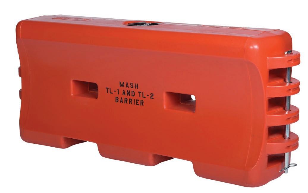 tion, while a tamper-resistant drain plug with coarse, buttress threading streamlines maintenance and eliminates cross-threading issues. Deployment efficiency is further enhanced by forklift and pallet jack slots for rapid repositioning, plus a hinged design that allows up to 30 degrees of pivot between sections. Each barrier comes standard with a galvanized steel connection pin, allowing sections to be securely linked into a continuous protective wall. The newly available