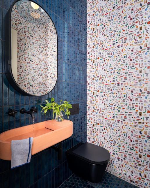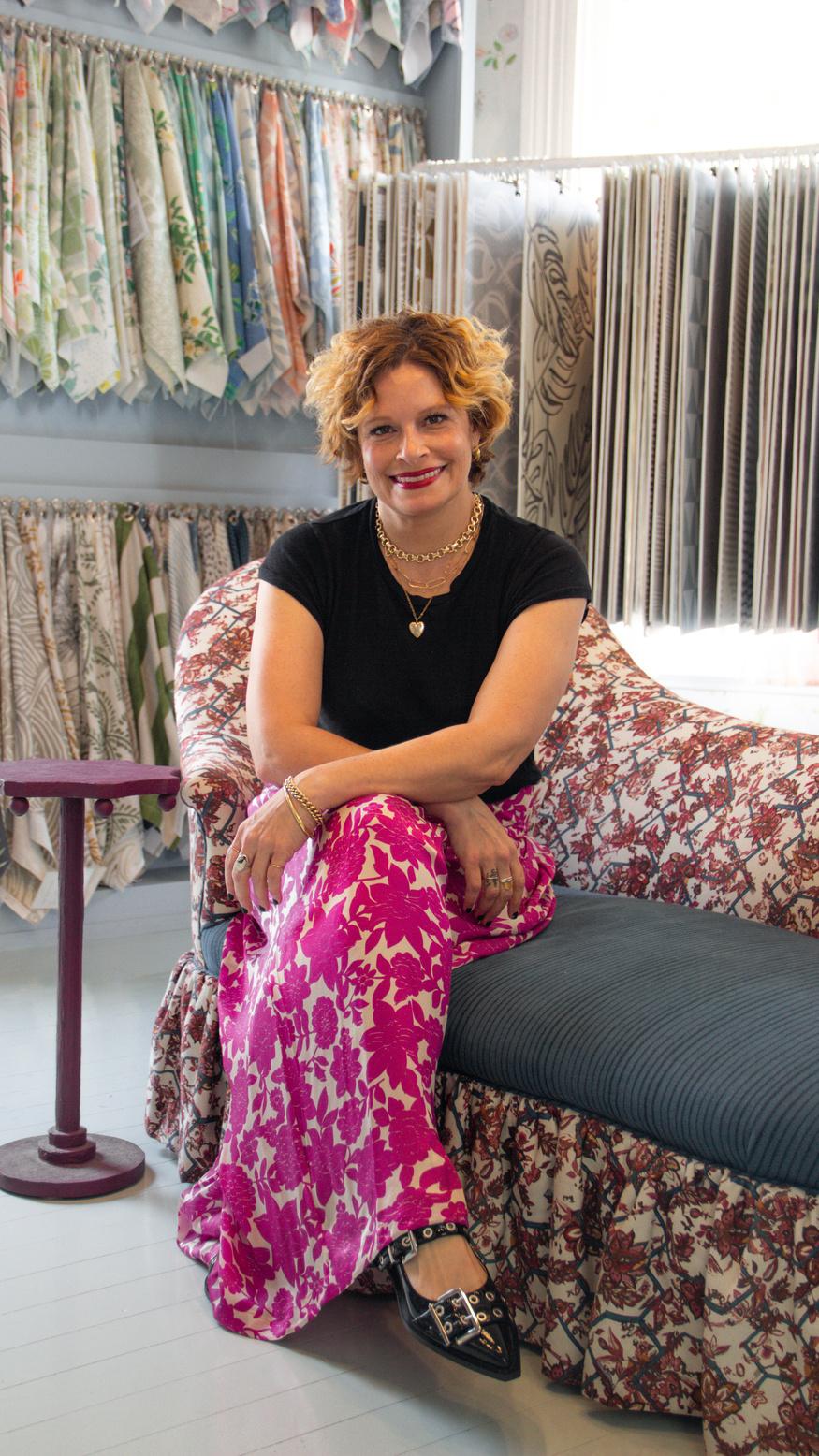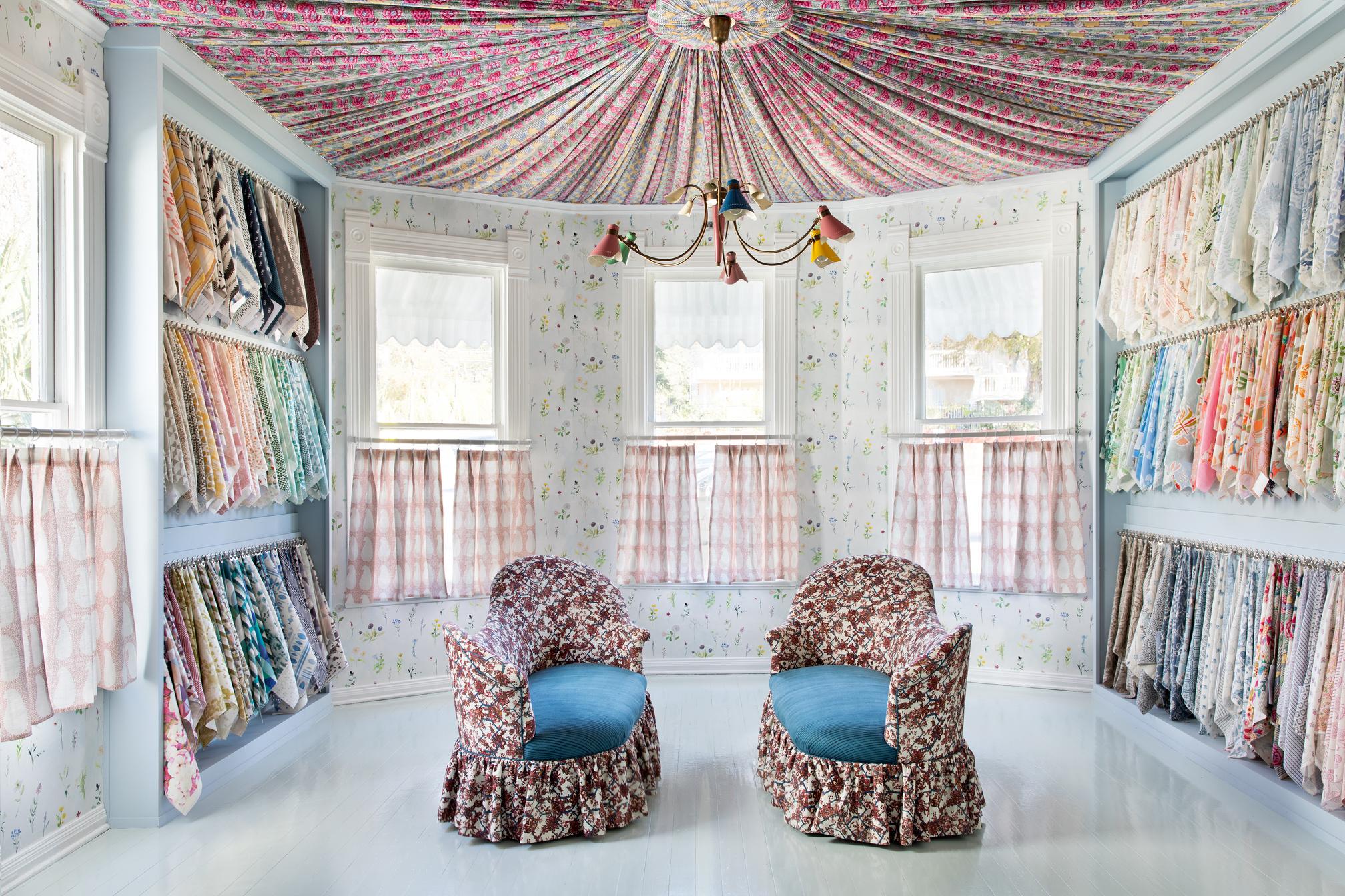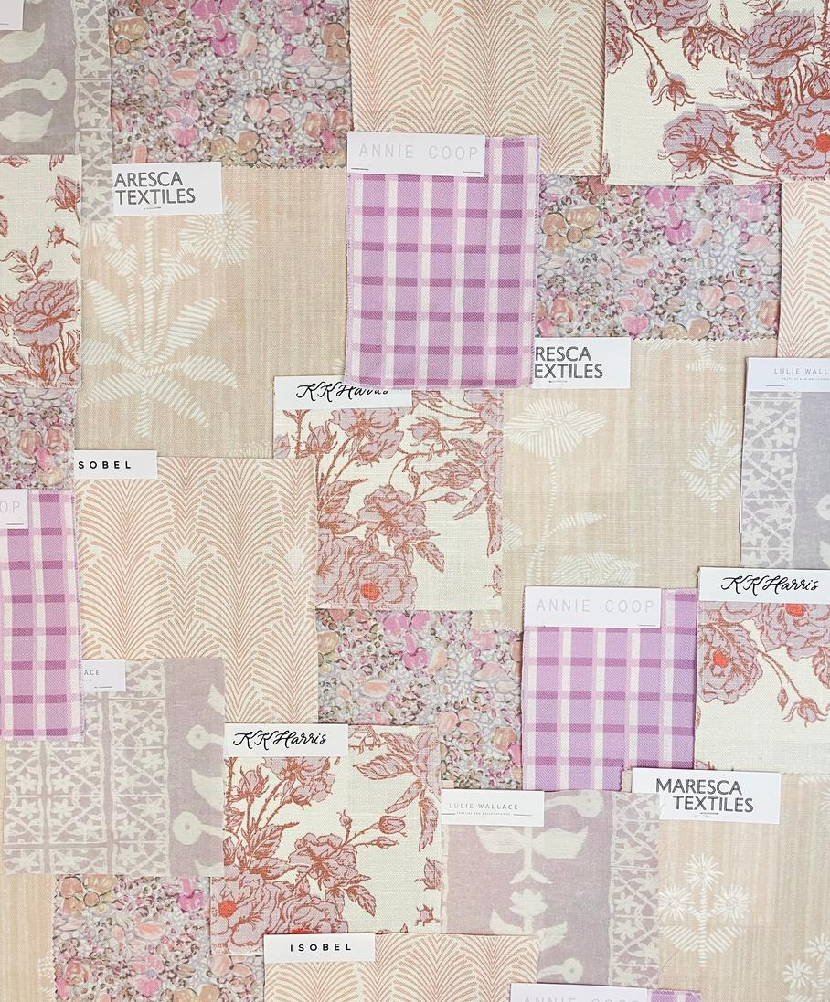 Pictured here: Play Day (wallpaper) by Kate Capone; Oleanda Woven (textile) by Virginia White; Roses for Charlie (textile) by Work + Sea; Ether (cement tile) by Thatcher