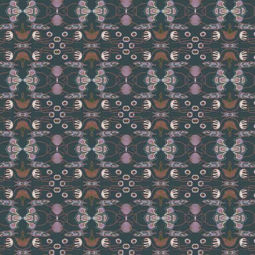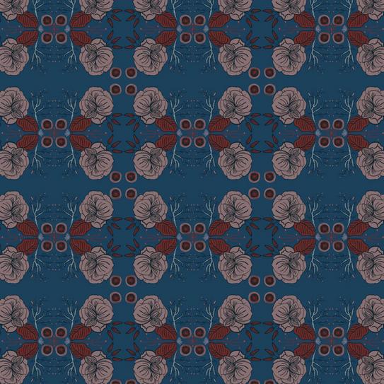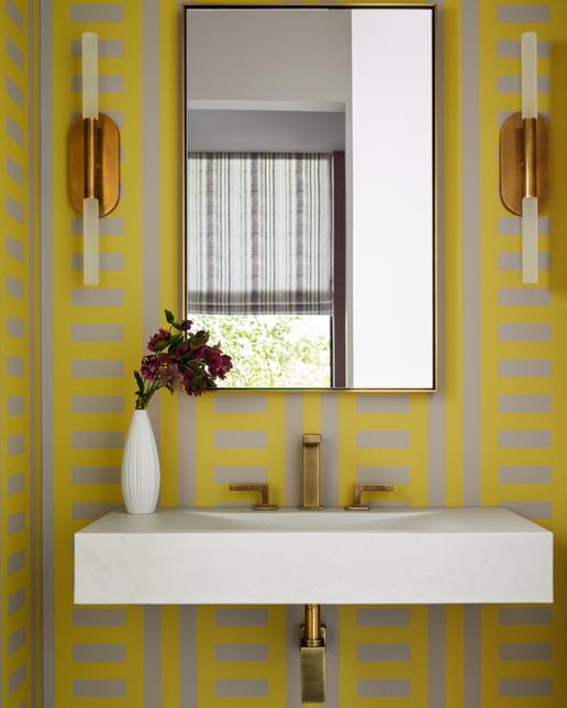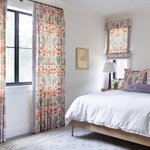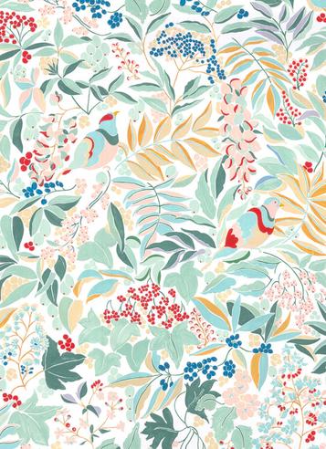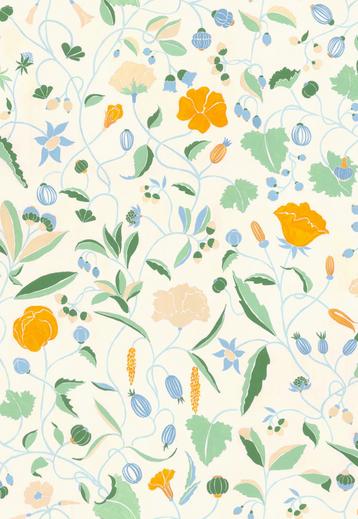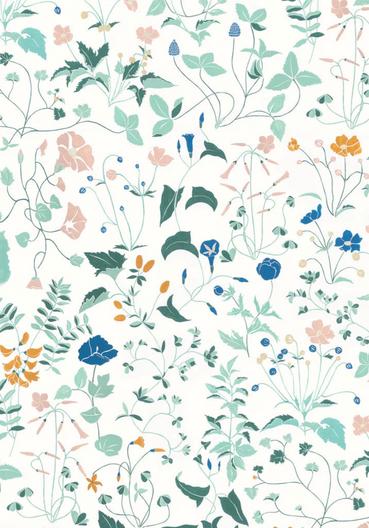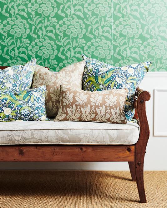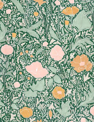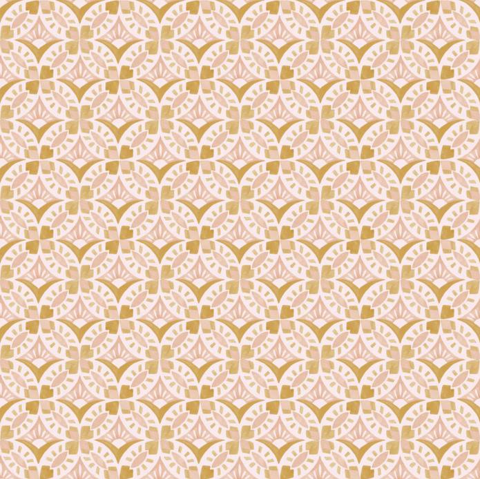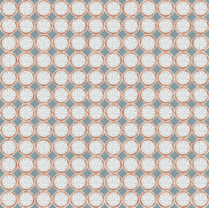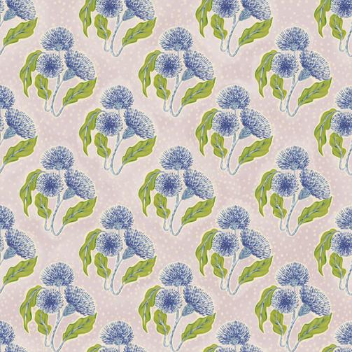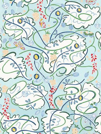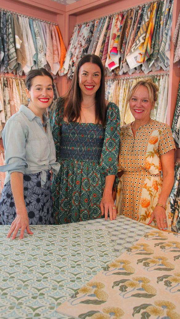 Pictured here: Play Day (wallpaper) by Kate Capone; Oleanda Woven (textile) by Virginia White; Roses for Charlie (textile) by Work + Sea; Ether (cement tile) by Thatcher