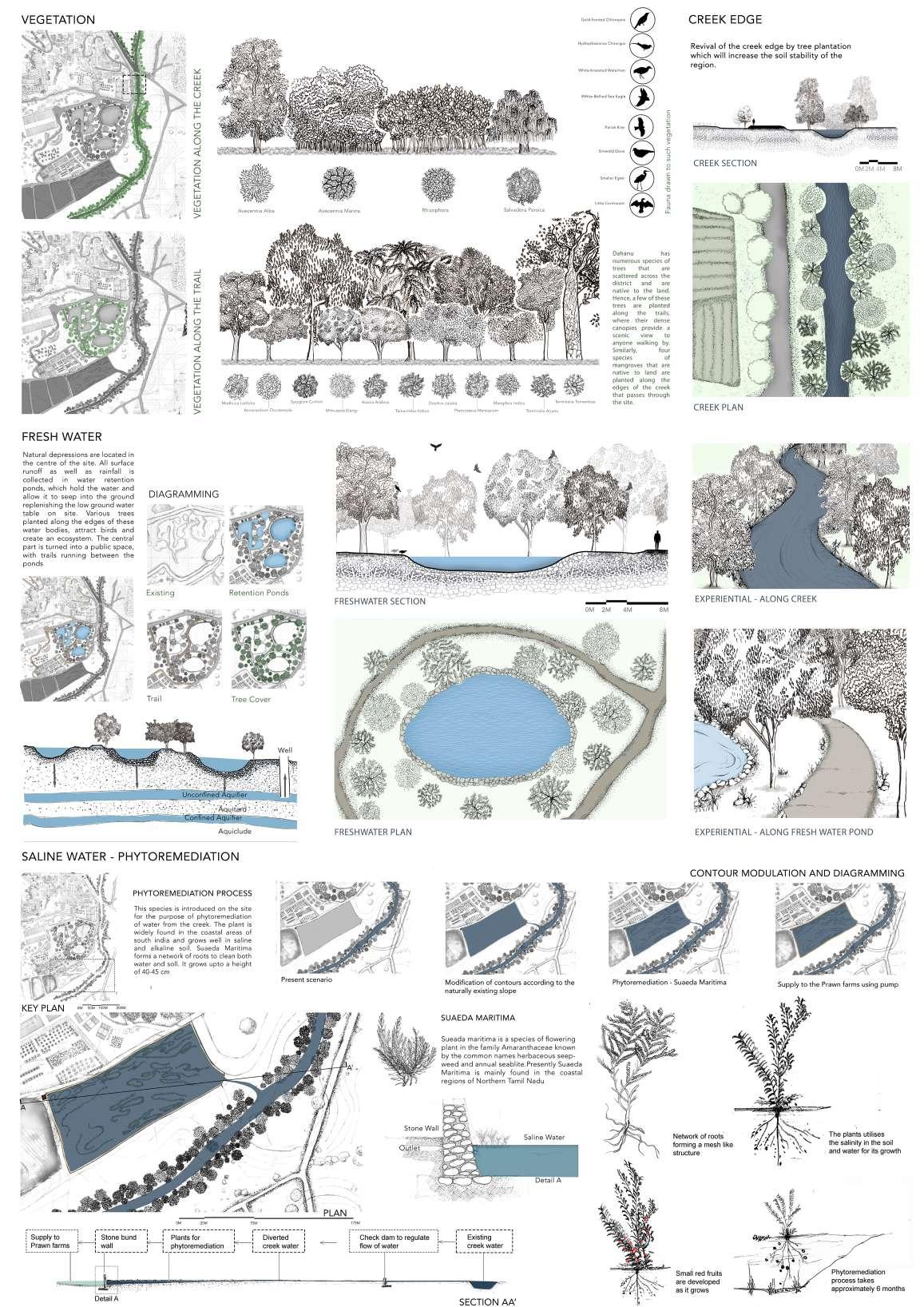 Systems that have been incorporated include plantation of specific species of trees along the edge of the creek, collection of rainwater, allowing the engagement of tourists with the landscape.