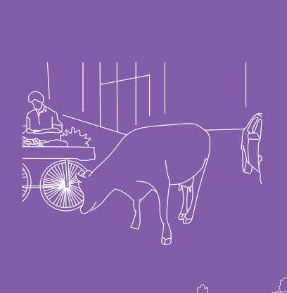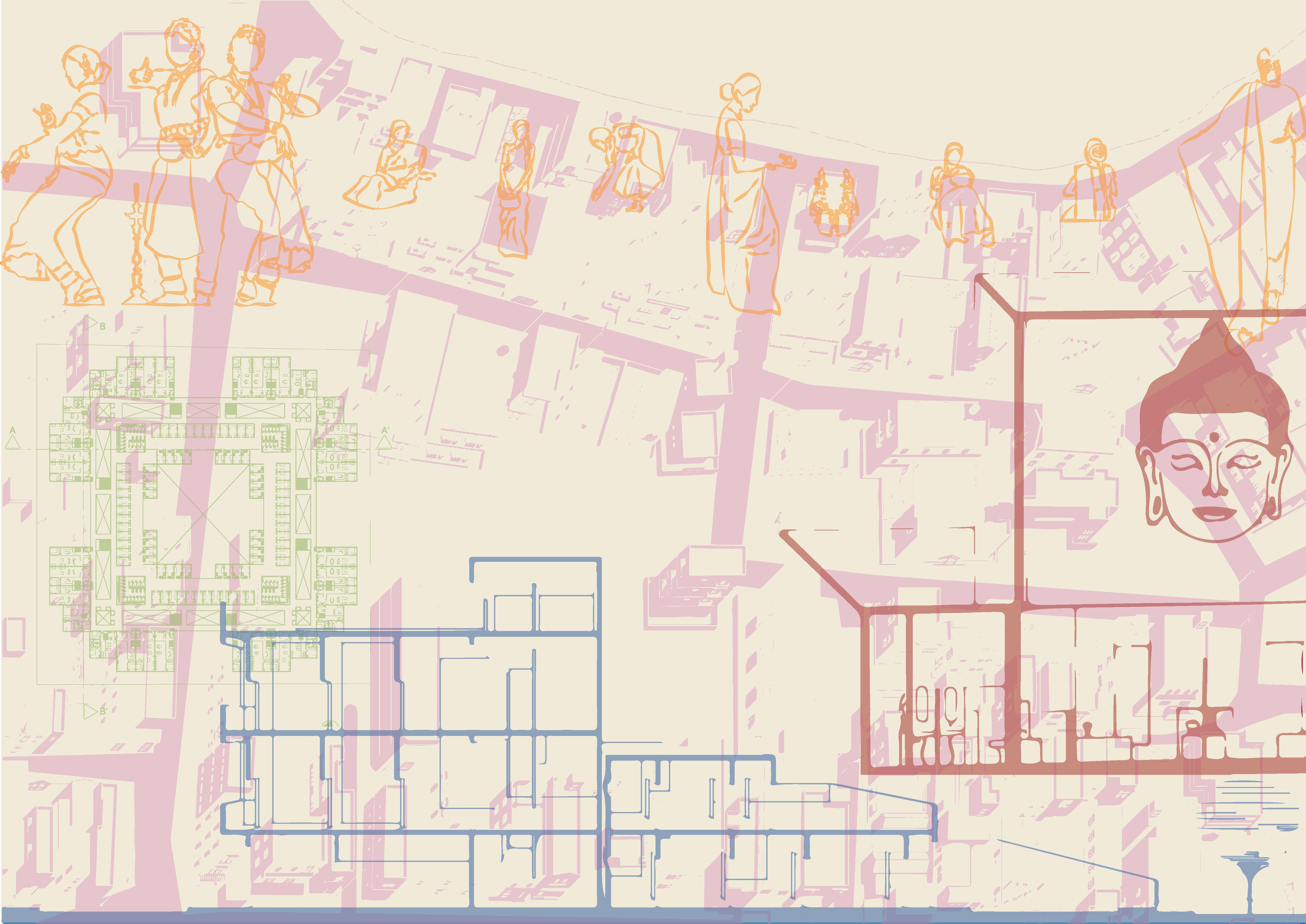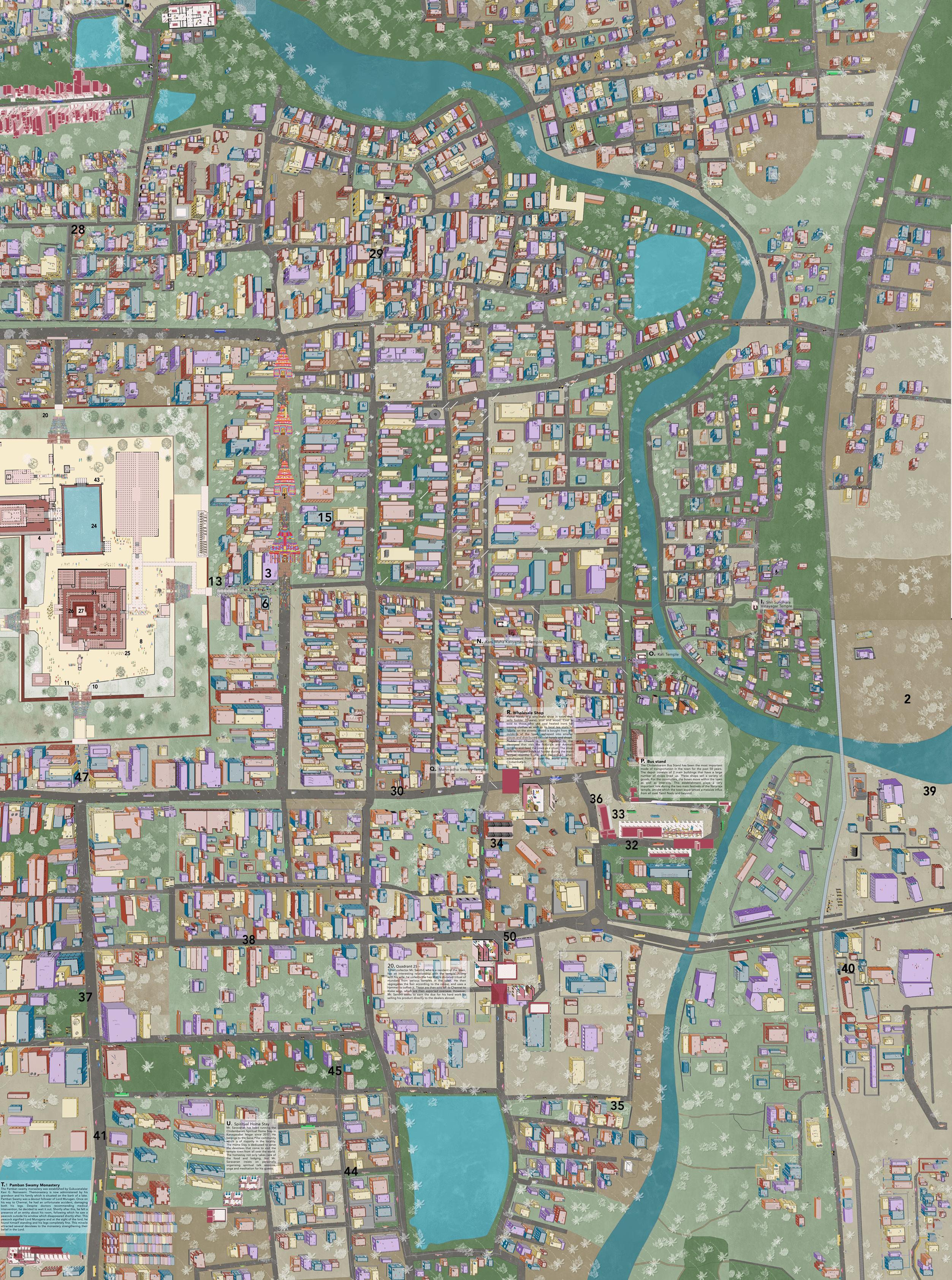The colour chosen to render the town emanates from the colours of the Gopuram. Additionally, the variation within the different colours of the built form of the town also influence the palette chosen for representation. The colour helps give character to the town by amalgamating the temple, its details, its people, and the fabric that they sit in.