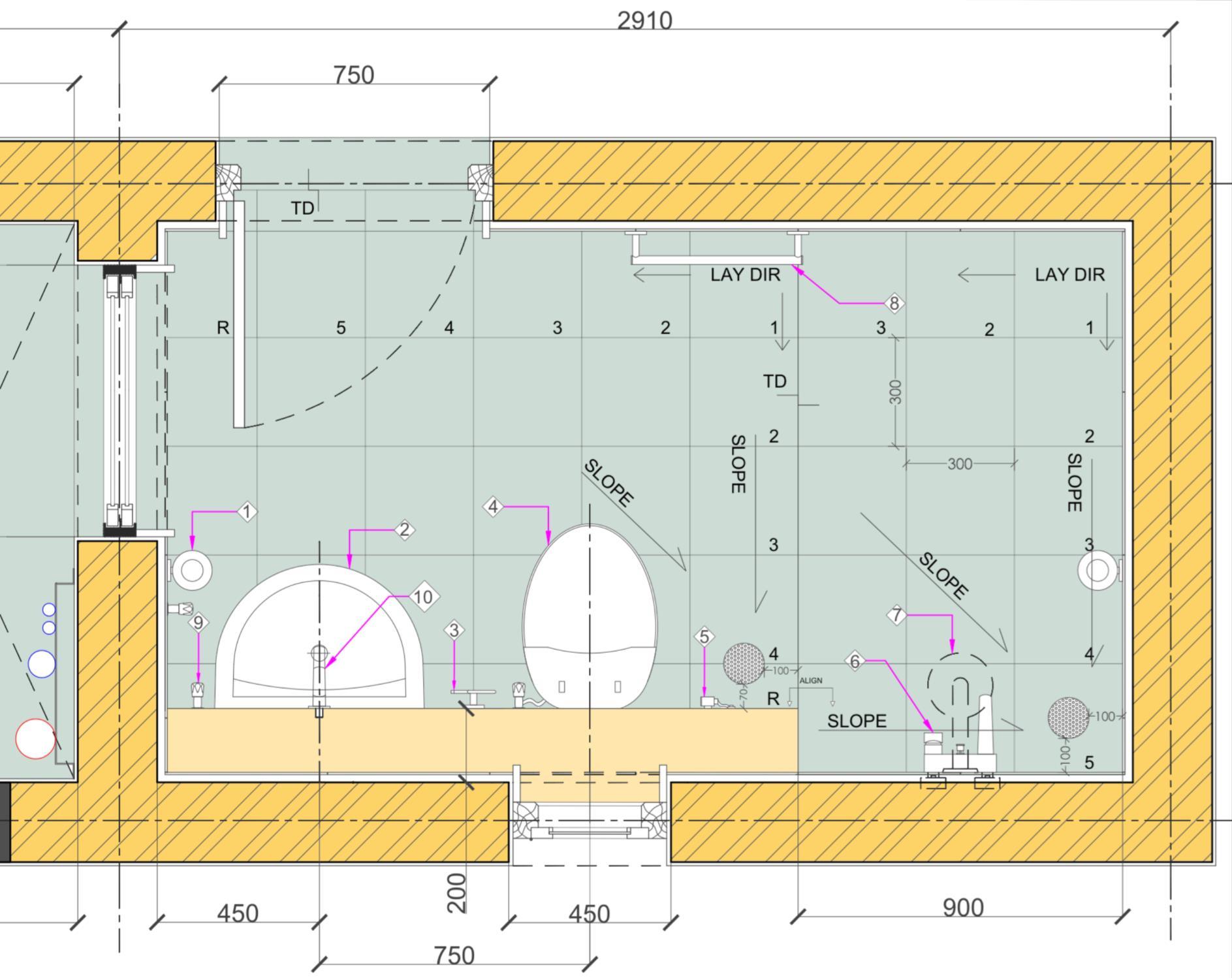 DRAWING TITLE SHEET NO. A3_8 SEAL AND SIGNATURE DATE 07/07/2022 SCALE :- 1:20 TOILET LAYOUT SECTION - DD' REFER SHEET NO_O9 FOR FIXTURE DETAILS 935 700 410 900 580 1000 420 3000 3000 3000 3100 900 220 120 780 450 510 80 560 100 1180 16700 COPING DRIP MOULD PARAPET WALL WEATHER PROOFING DRIP MOULD BEAM 220 X 450 COMPOUND WALL SCREED MORTAR FLOORING 10 MM SILL GUTTER PEDESTAL FOOTING PCC BED AGGREGATE ROAD 2500 RETAINING WALL GROUND FLOOR 350 MM SITE LEVEL 200 MM ROAD LEVEL 0 MM FIRST FLOOR 3750 MM SECOND FLOOR 7000 MM THIRD FLOOR 10250 MM TERRACE 13500 MM BASEMENT - 2350 MM GENERAL NOTES 1. All dimensions are in 'mm'. 2. Drawings not be measured but written dimensions to be followed. 3. For structural details refer drawings issued by structural consultant. 4.This drawing to be read in conjunction with all relevant architect's, service engineer's, drawings and specifications. LEGEND: TITLE OF PROJECT: IKYA - EXTENDED FAMILY Kalyani Nagar Road, Mysuru N All Dimensions are in 'mm' DATE 07/07/2022 DRAWING TITLE WALL SECTION-1 SEAL AND SIGNATURE Drawn by SUPREETH M (4CM19AT072) SHEET NO. A3_01 SCALE SECTION @1:50 DETAILS @1:10 COPING PARAPET DRIP GROVE WEATHER PROOFING LAYER SCREED RCC SLAB RCC BEAM 10 MM PLASTER 10 MM PLASTER RCC LINTEL WITH CHAJJA WINDOW FRAME DRIP GROVE TILES SKIRTING B C D DETAIL-A DETAIL-B DETAIL-C DETAIL-D A TERRACE 13500 MM THIRD FLOOR 10250 MM SECOND FLOOR 7000 MM FIRST FLOOR 3750 MM GROUND FLOOR 350 MM SITE LEVEL 200 MM ROAD LEVEL 0 MM PEDESTAL FOOTING PCC BED AGGREGATE RETAINING WALL GUTTER COMPOUND WALL COPING DRIP MOULD PARAPET WALL WEATHER PROOFING SCREED LINTEL WINDOW FRAME STONE JAMB SUNKEN SLAB MORTAR FLOORING 10 MM LEGEND: TITLE OF PROJECT: IKYA - EXTENDED FAMILY Kalyani Nagar Road, Mysuru N All Dimensions are in 'mm' DATE 07/07/2022 DRAWING TITLE WALL SECTION-2 SEAL AND SIGNATURE Drawn by SUPREETH M (4CM19AT072) SHEET NO. A3_02 SCALE :- SECTION @1:50 DETAILS @1:10 C D DETAIL-A DETAIL-B DETAIL-C DETAIL-D A COPING PARAPET DRIP GROVE 10 MM PLASTER WEATHER PROOFING LAYER SCREED RCC SLAB RCC BEAM 10 MM PLASTER 10 MM PLASTER BRICK WALL CINDER FILLING CERAMIC WALL TILE 2 MM WATERPROOFING SUNKEN BEAM PLASTER WITH PCC STONE JAMB PLASTER 10 MM WINDOW SHUTTER WINDOW FRAME LINTEL SUNKEN SLAB CERAMIC FLOOR TILE 220 120 780 450 2850 2850 2850 3100 900 16700 2500 150 500 900 TERRACE 13500 MM THIRD FLOOR 10250 MM SECOND FLOOR 7000 MM FIRST FLOOR 3750 MM GROUND FLOOR 350 MM SITE LEVEL 200 MM BASEMENT - 2350 MM ROAD LEVEL 0 MM PEDESTAL FOOTING PCC BED AGGREGATE RETAINING WALL GUTTER COMPOUND WALL COPING DRIP MOULD PARAPET WALL WEATHER PROOFING SCREED LINTEL WINDOW FRAME STONE JAMB SUNKEN SLAB MORTAR FLOORING 10 MM B C D DETAIL-A DETAIL-B DETAIL-C A COPING PARAPET DRIP GROVE 10 MM PLASTER WEATHER PROOFING LAYER SCREED RCC SLAB RCC BEAM 10 MM PLASTER 10 MM PLASTER BRICK WALL CERAMIC WALL TILE 2 MM WATERPROOFING PLASTER WITH PCC STONE JAMB PLASTER 10 MM WINDOW SHUTTER WINDOW FRAME LINTEL CERAMIC FLOOR TILE E F