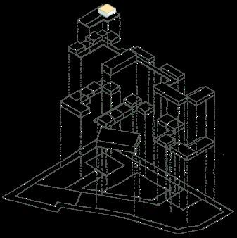 6. Sloping roof running throughout, above the built as well as the courtyards. The roof sloping outwards, where as the corridors along the periphery are protected by the louvers and pergolas on all three sides
