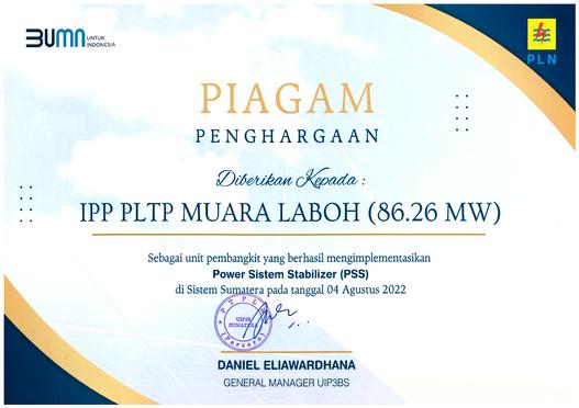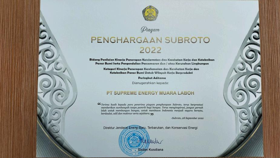 PT Supreme Energy Muara Laboh (SEML) obtained a certificate for contribution to support PLN programs in strengthening the grid:
