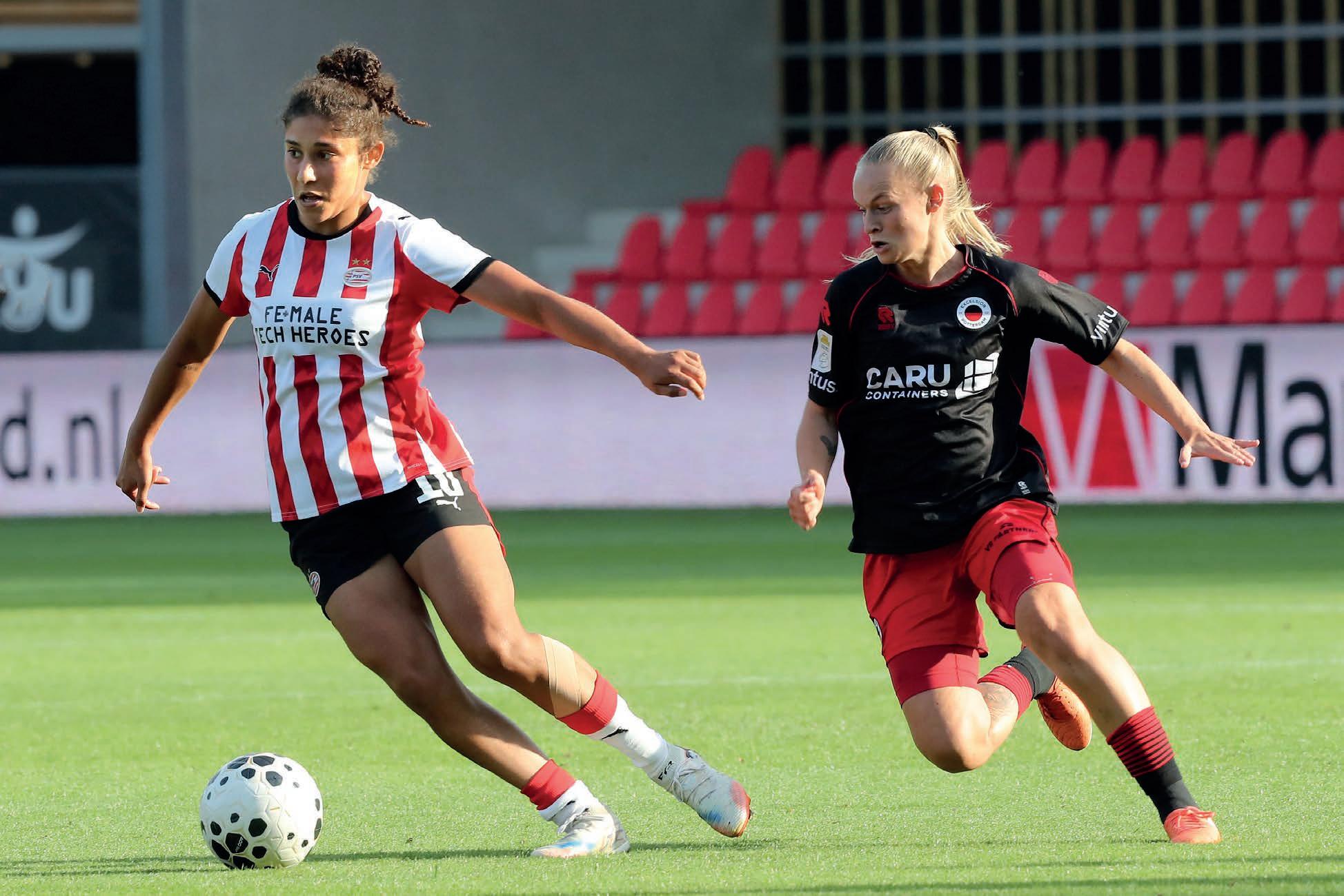 OP EEN DRUKKE DOORDEWEEKSE DAG OP PSV CAMPUS DE HERDGANG, NA TWEE INTENSIEVE TRAININGEN, MAAKT CHIMERA RIPA (23) GRAAG TIJD VOOR EEN INTERVIEW. DE AANVALLENDE MIDDENVELDSTER – INMIDDELS BEZIG AAN HAAR VIERDE SEIZOEN BIJ PSV – STRAALT ZOWEL BESCHEIDENHEID ALS AMBITIE UIT. RIPA KOMT DAGELIJKS OP DE FIETS NAAR DE TRAINING EN VOELT ZICH HELEMAAL THUIS IN EINDHOVEN. “MIJN FAMILIE EN VRIENDEN ZITTEN IN AMSTERDAM-WEST, WAAR IK BEN OPGEGROEID, MAAR EINDHOVEN IS MIJN THUIS GEWORDEN. IK WOON HIER LEKKER OP M’N STEK,” VERTELT ZE MET EEN GLIMLACH. ONLANGS VERLENGDE ZE HAAR CONTRACT TOT MEDIO 2028. EEN TEKEN DAT ZE HAAR TOEKOMST BIJ PSV VOL VERTROUWEN TEGEMOET ZIET.