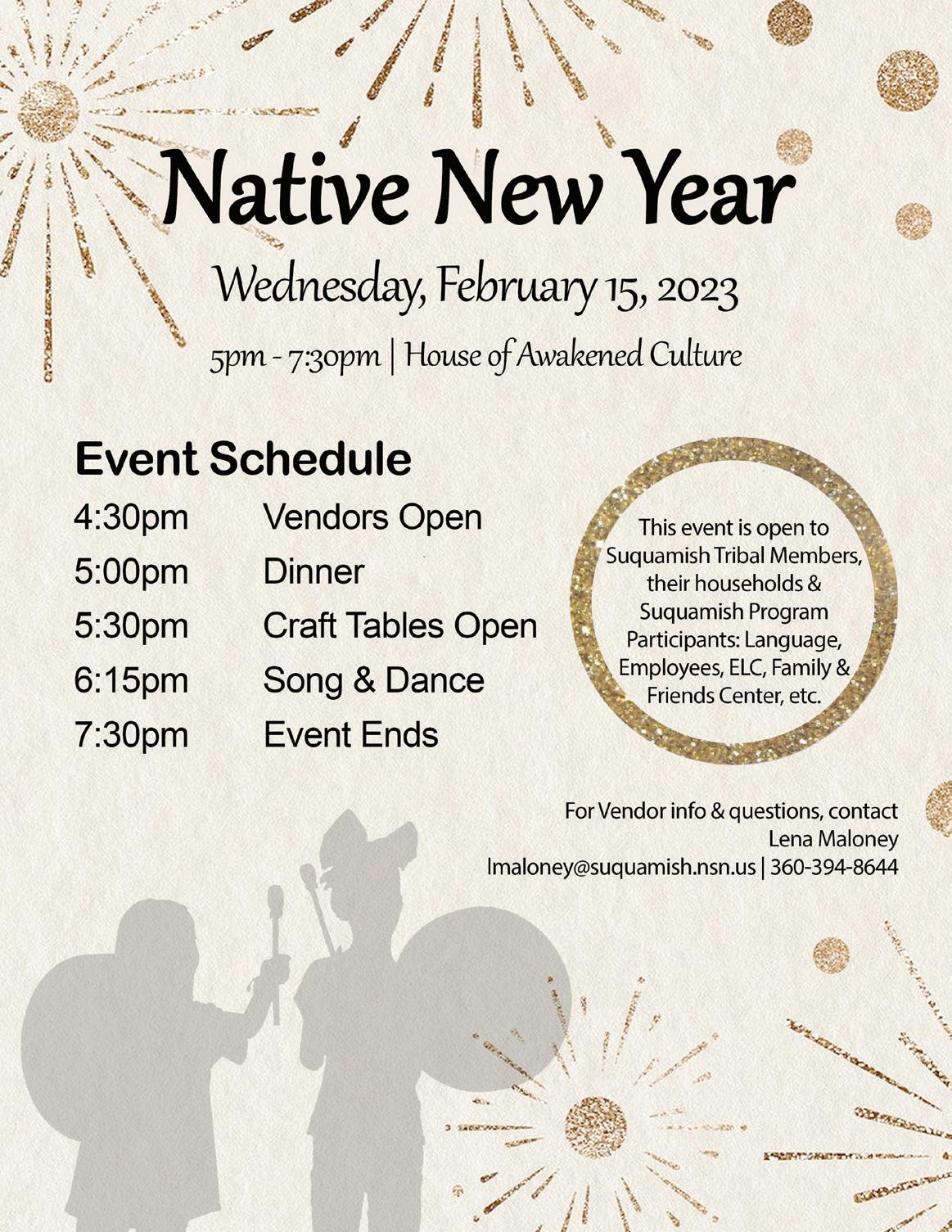 Feb.15, 5-7:30pm at House of Awakened Culture. For vendor info & questions contact Lena Maloney, (360) 394-8644 or lmaloney @suquamish.nsn.us