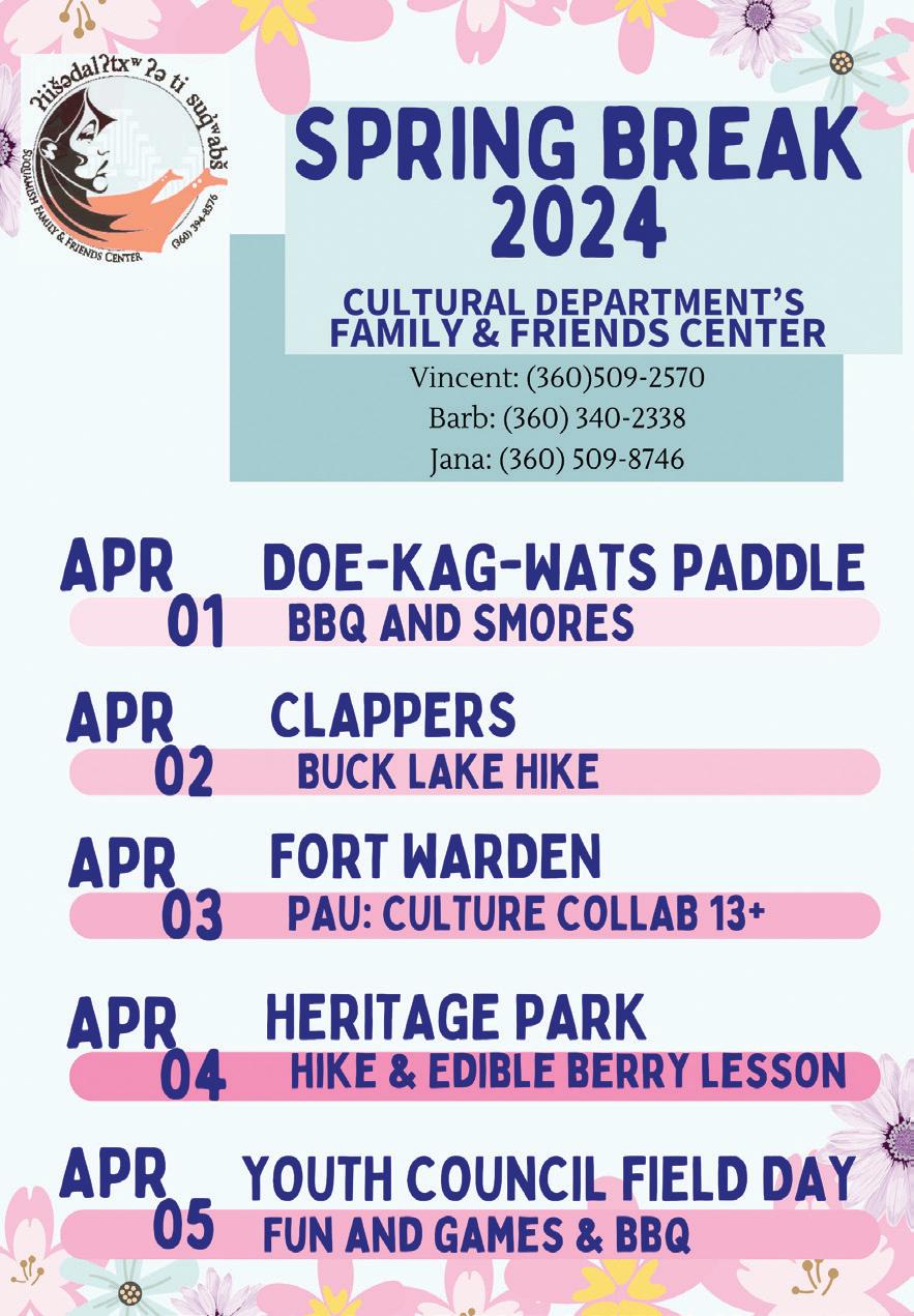 Family & Friends Spring Break, April 1-5. For info, contact Jana Mills at (360) 394-8576 or fandfcenter@suquamish.nsn.us.