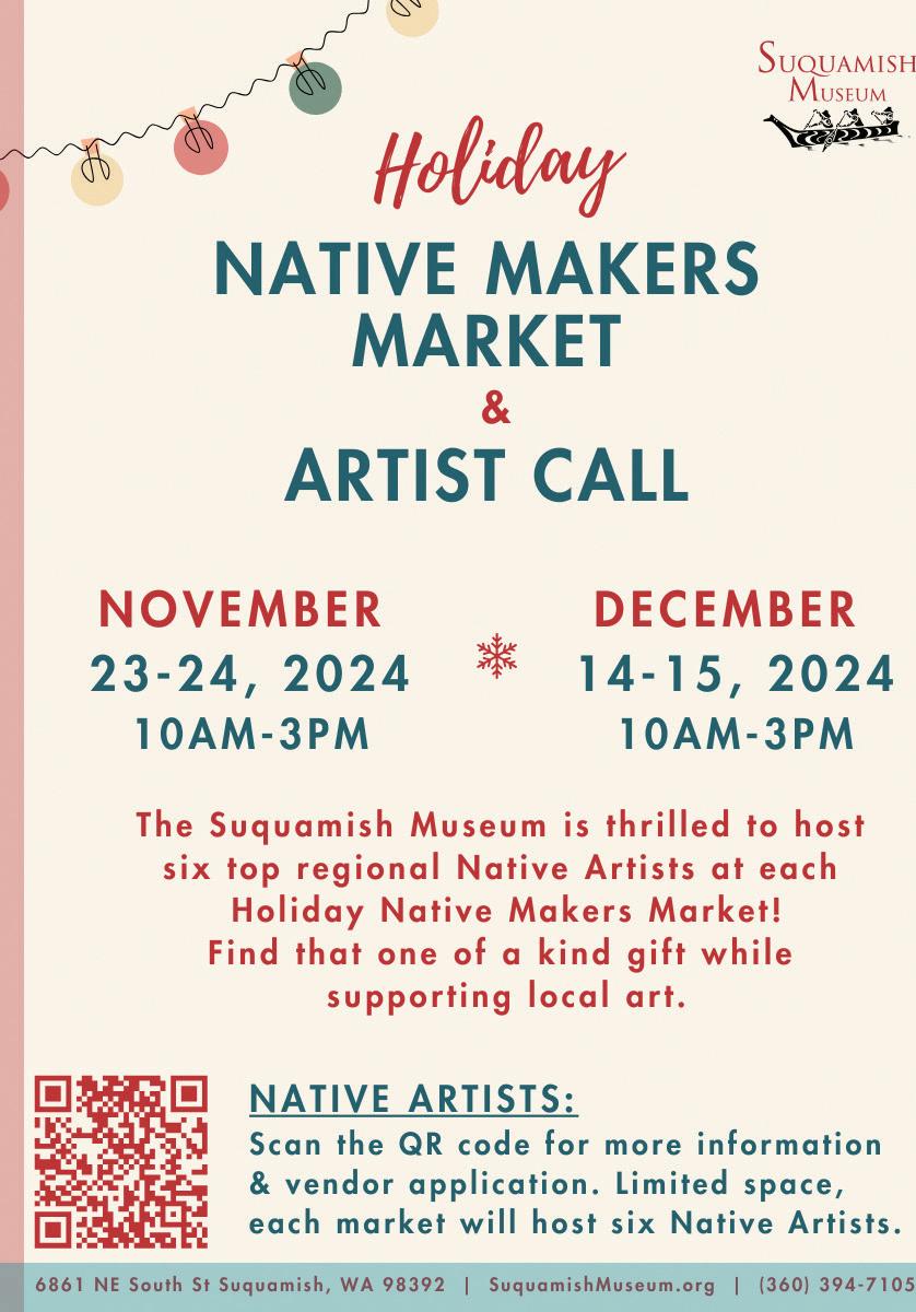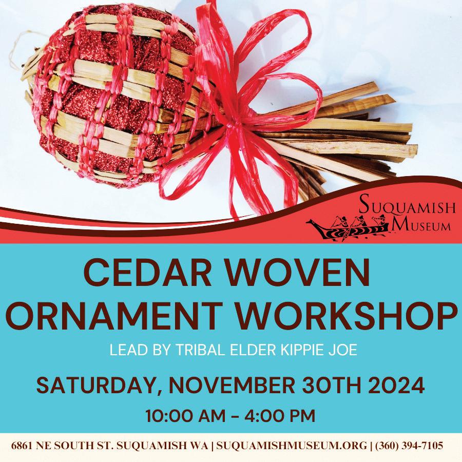Nov 9 Sat, 10am - 4pm. Small Cedar Basket Workshop with Kippie Joe Nov 10 Sun, 1pm - 4pm. Beading Workshop with Ariana Griggs Nov 23 - 24 10am - 3pm. Holiday Native Makers Market. FREE Nov 28 & 29 Museum closed for holiday Nov 30 Sat, 10am - 4pm. Cedar Woven Ornament Workshop with Kippie Joe