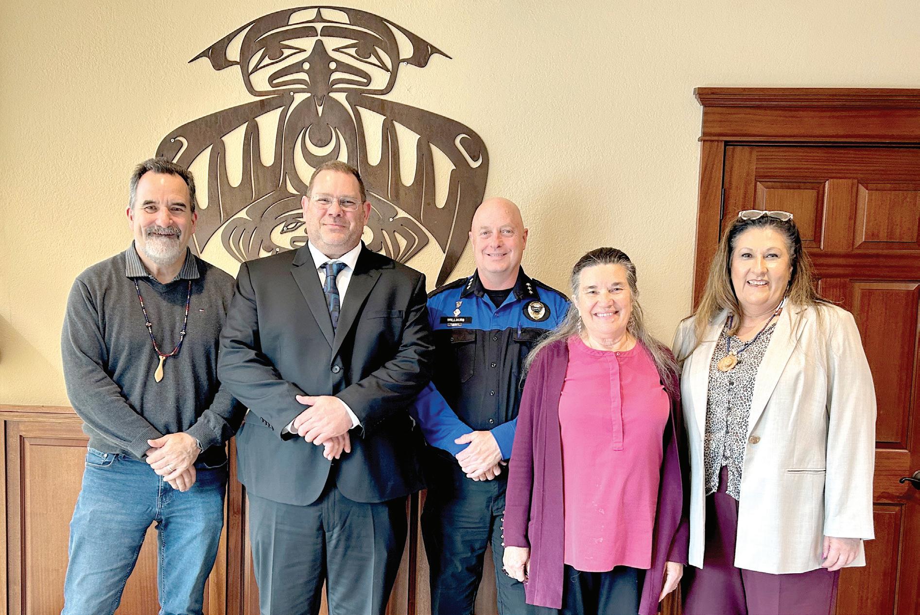 Left: Suquamish carver Randi Purser. Below from left: Bainbridge Island City Council members Leslie Schneider, Jon Quitslund, Clarence Moriwaki, Brenda Fantroy-Johnson, and Mayor Joe Deets celebrate with Suquamish carver Randi Purser.