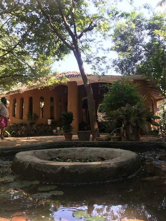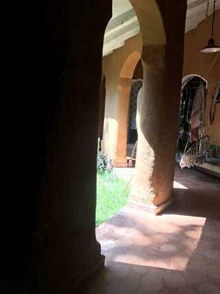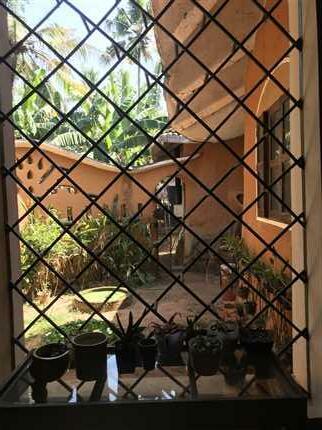 • T h e i n s i d e - o u t s i d e c o n n e c t i v i t y i s w e l l - b a l a n c e d a n d e f f e c t e d t h r o u g h o p e n a r c h e s ( w i t h s a f e t y g r i l l s i n m i l d s t e e l ) f l a n k e d b y m u d c o l u m n s a n d l a r g e t e a k w o o d - c l a d w i n d o w s .