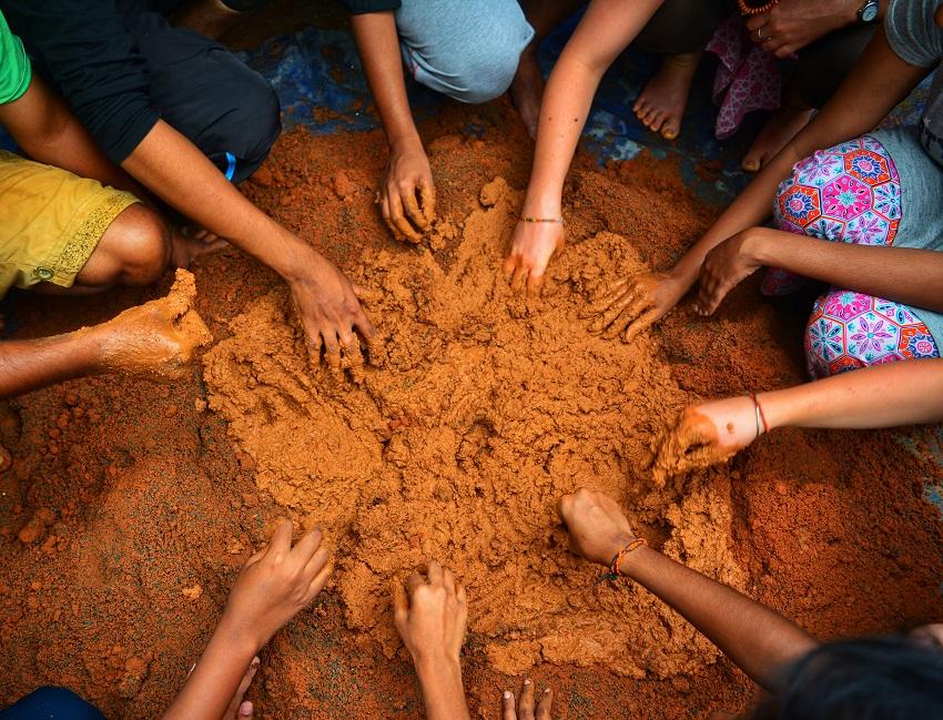 M u d r e q u i r e d f o r b u i l d i n g c a n b e t a k e n f r o m t h e p l o t i t s e l f . T h e s o i l i s c o l l e c t e d a f t e r d e p t h o f 6 0 c m s o n l y . A s t h e t o p l a y e r i s f u l l o f o r g a n i c m a t t e r , i t i s n ’ t u s e d . B e l o w i t i s s a n d a n d c l a y w h i c h a r e d u g o u t i n h e a p s . D o n o t u s e h a r d r o c k .
