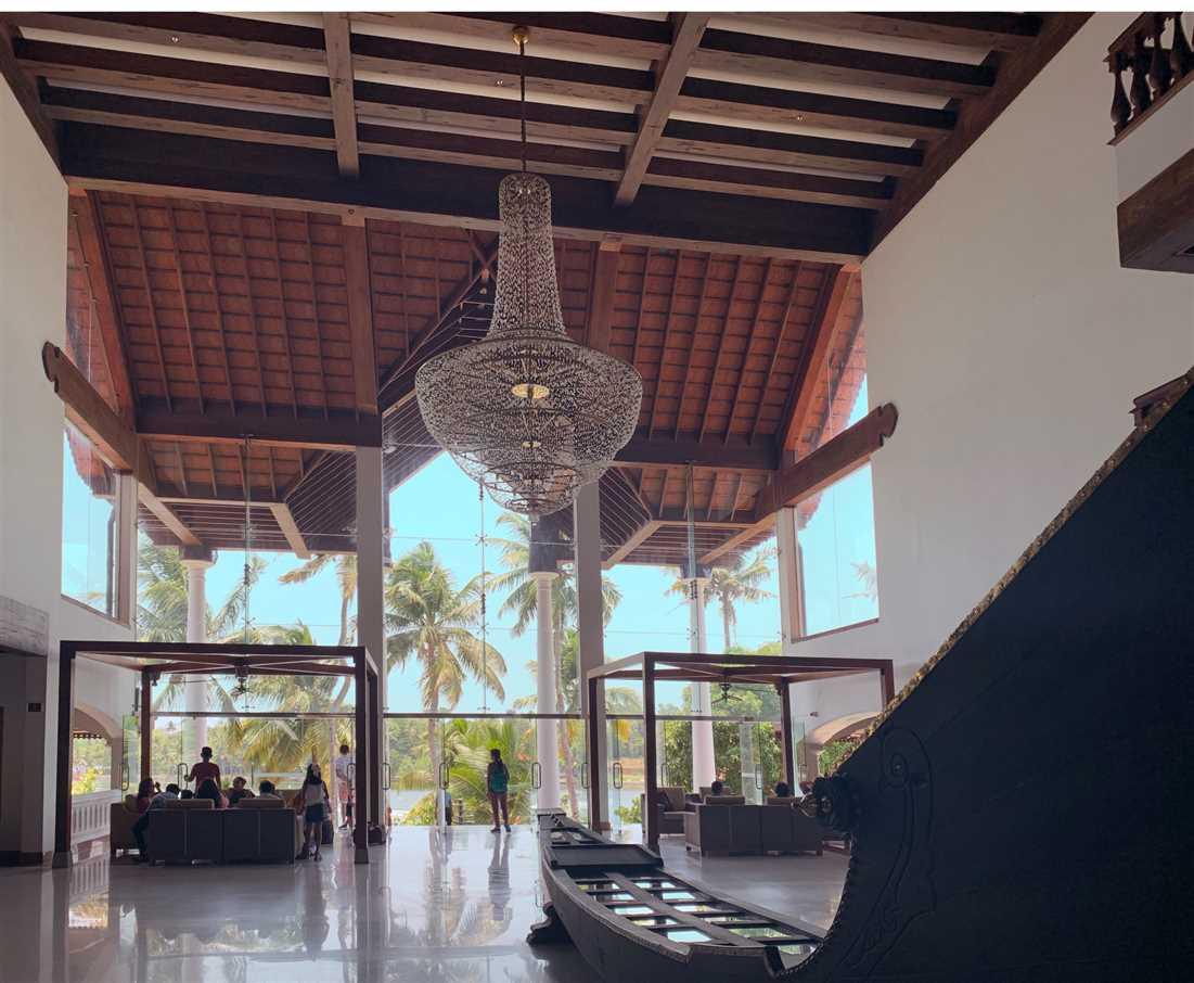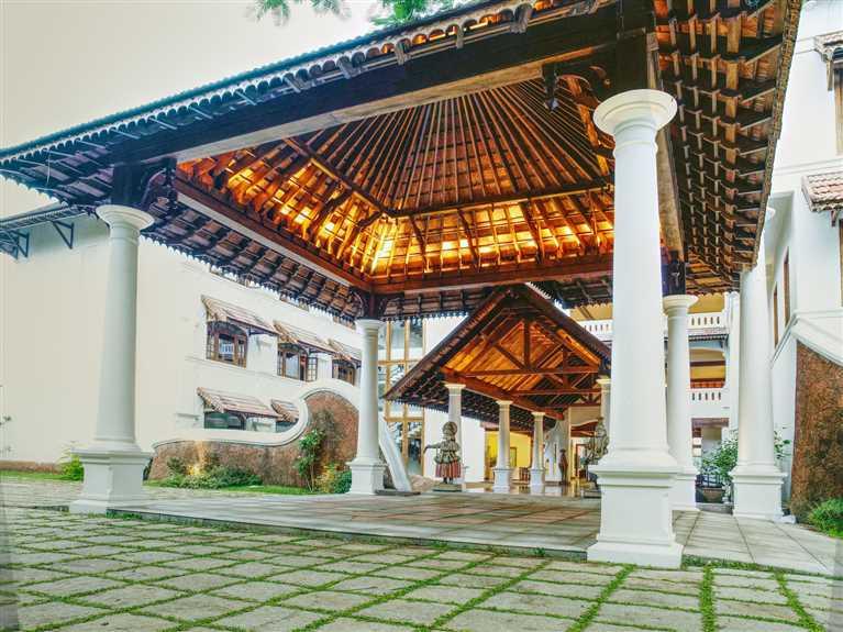 A n i n f o r m a l s e a t i n g a l c o v e , w h i c h d r a w s i n s p i r a t i o n f r o m t h e t r a d i t i o n a l f o y e r o f a K e r a l a h o m e , i s p l a c e d r i g h t n e x t t o t h e e n t r a n c e . I t a f f o r d s a v i e w o f o n e o f t h e s o u t h e r n c o u r t y a r d s .