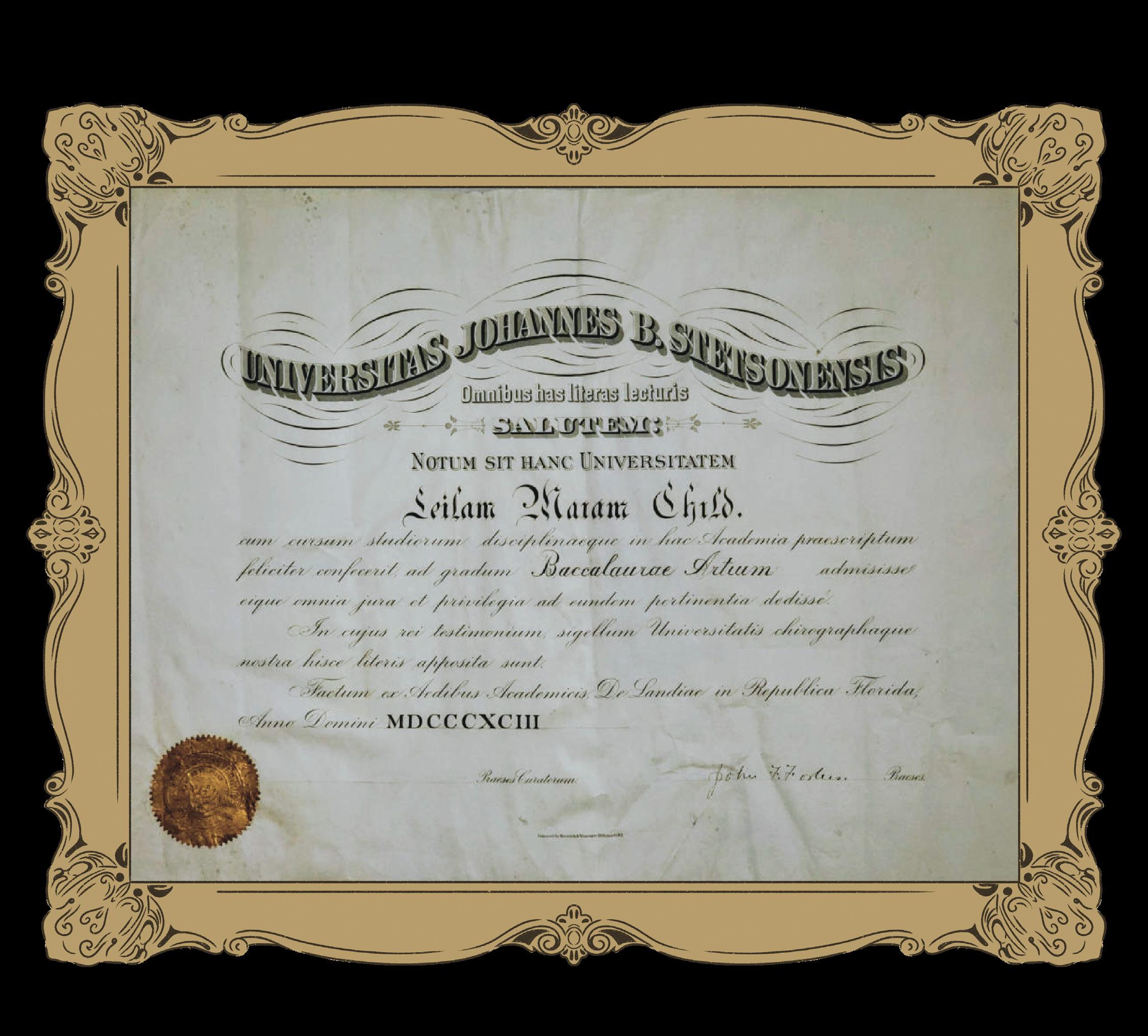 Flash forward to Betty Carol and David Mann, descendants of Leila May. They have graciously provided Stetson with many of the physical relics we now have of her time here, most notably, her actual 1893 diploma. When Betty recalled the first time learning about her grandmother’s connection to Stetson, she said “I looked up Stetson online, like, okay, I just called the registrar you guys exist?” Once getting in contact with Stetson University, though, both sides were thrilled to have more information. David and Betty even personally traveled to Stetson to gift Leila May’s physical diploma to the university, where it still currently resides in the Stetson archives.