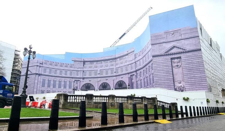 The Admiralty Arch CGI scaffold wrap in London, currently being transformed into the Waldorf Astoria London and expected to open later this year, features plywood cladding on the gantry structure plus printed ACP panels at lower levels (where durability matters). Embrace Building Wraps photo