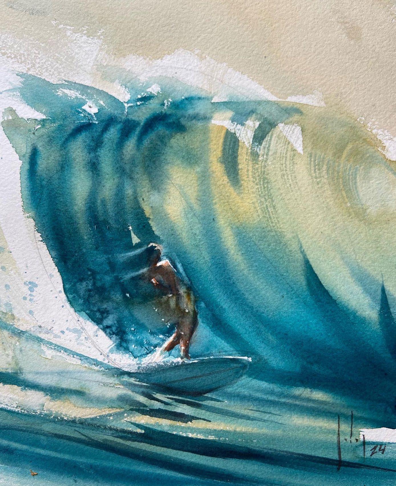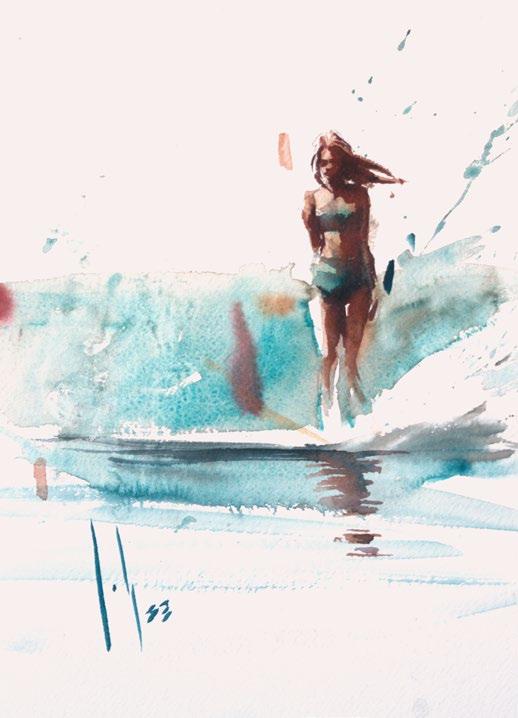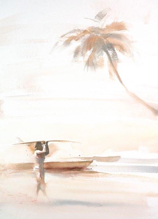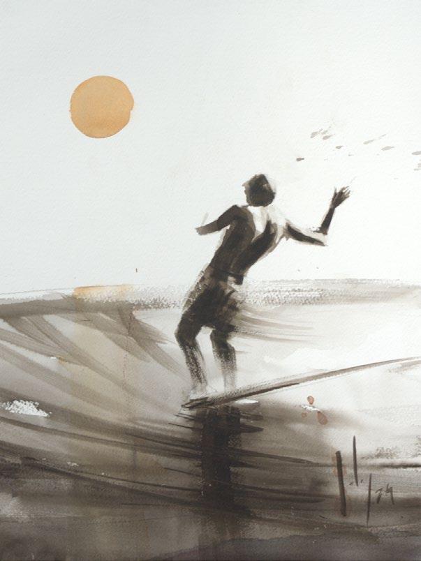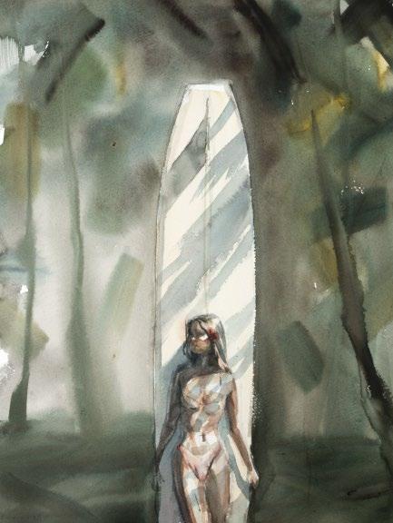 Surfing also became a bridge and a platform to a world of creating. Nowadays, he is dedicated to painting with watercolor, transfering the essence of surfing, traveling, and exploration of empty lineups into a painting.
