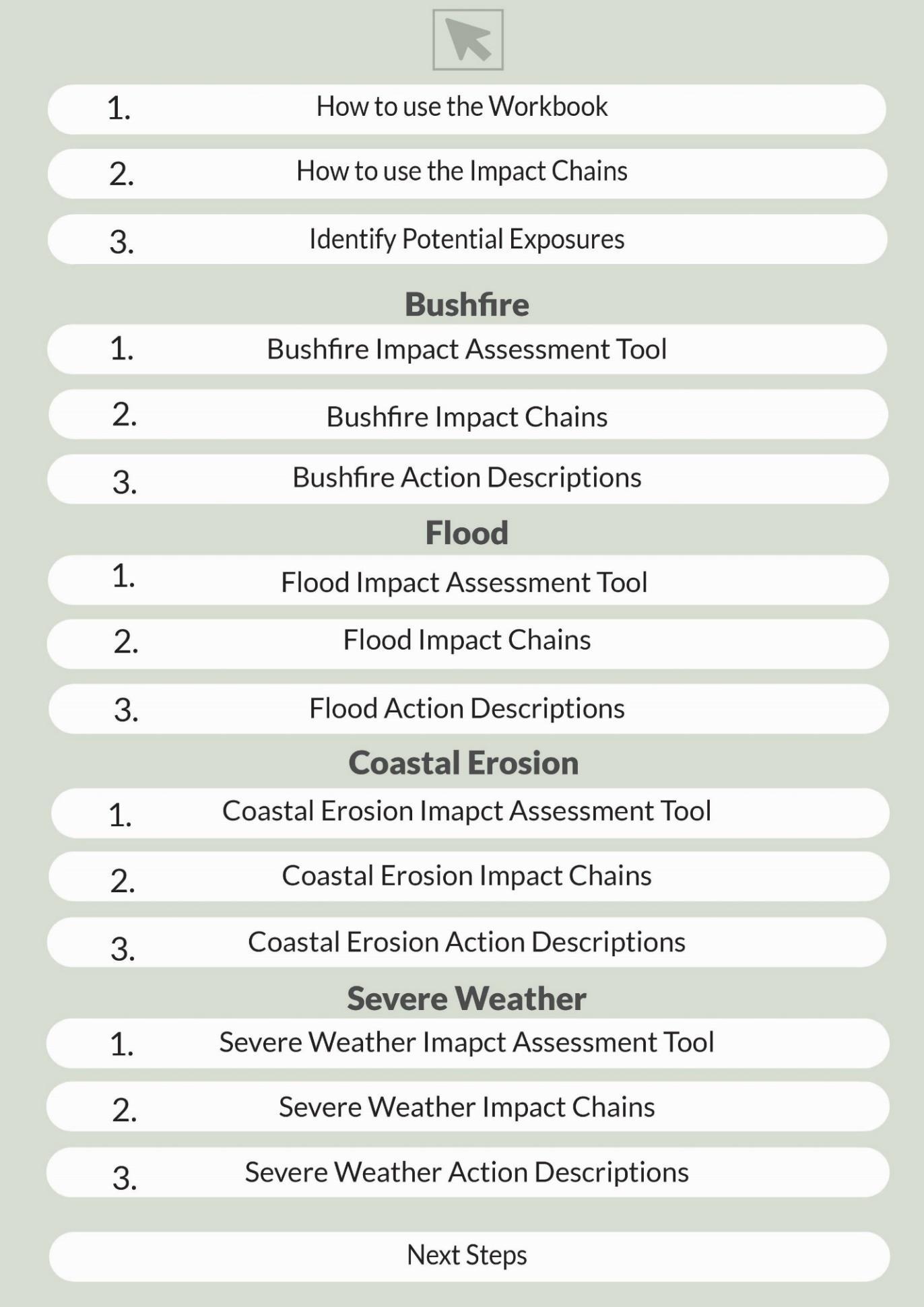 This workbook has been developed to assist Surf Life Saving Clubs (clubs) in self-assessing the potential impact of four natural hazards: bushfire, cyclone, flood, and coastal erosion on their club services, assets and people. The workbook is structured to guide clubs through: