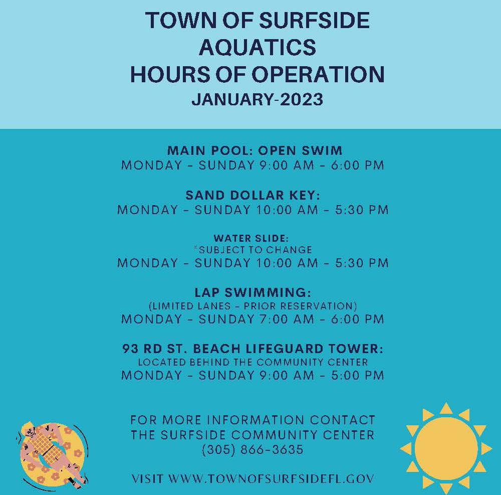 01/02/23 Holiday - Town Hall Closed 01/07/23 Surfside Under the Stars: World Beats | 6 PM 01/09/23 Tourist Board Meeting | 5:30 PM 01/10/23 Special Town Commission Meeting | 5:30 PM 01/10/23 Commission Meeting | 7 PM 01/13/23 Senior Brunch | 11 AM 01/15/23 Family Fun Day | 1 PM 01/15/23