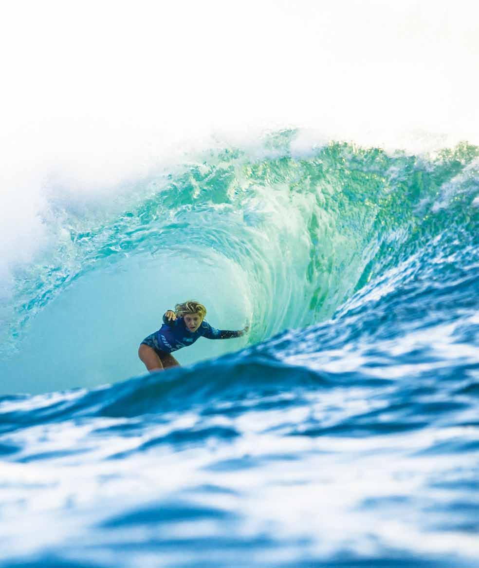 The magic arena where history was made by a 15 year old girl who made it to the finals of a men’s barrel riding contest in pumping eight foot surf. Photography by Matt George