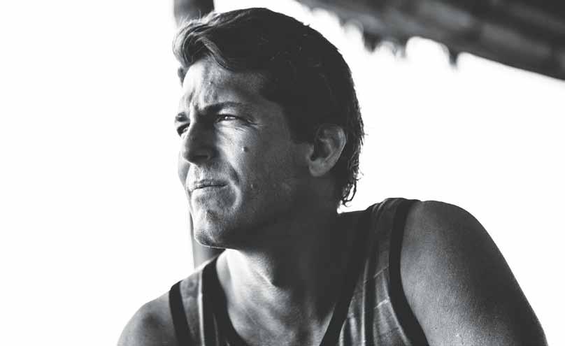 up and down. Surveying his domain. Judging it. Suspicious. It’s his territory, but it seems to him constantly under threat. Like that black cobra, tongue flicking, but alert, up for the hunt. And you can forget about talking to him. Not unless you are on the inside. Family. He is coiled, guarded against onslaught. His fangs are not out, bu t they are there. And they can drip poison. Spending time with him, you realize he very much lives in his own castle, his thoughts defended by ramparts and a drawbridge rarely let down. He is a self-elec ted master of his own universe, and his aura expands and contracts like a concertina. At times overwhelming, taking you in, and at other times shoving you away with both hands. You find yourself always aware of his strike zone. His words that can crush you. Make you feel small. Make the world seem ridiculous. His wide smile dismissive. It can be downright disturbing to try and talk to him. Perhaps that’s what makes his surfing so considerable. That no-talk zone. That and those eyes so busy with his relentless thoughts that have less to do with your presence and more to do with the concerns he carries as a daily burden.