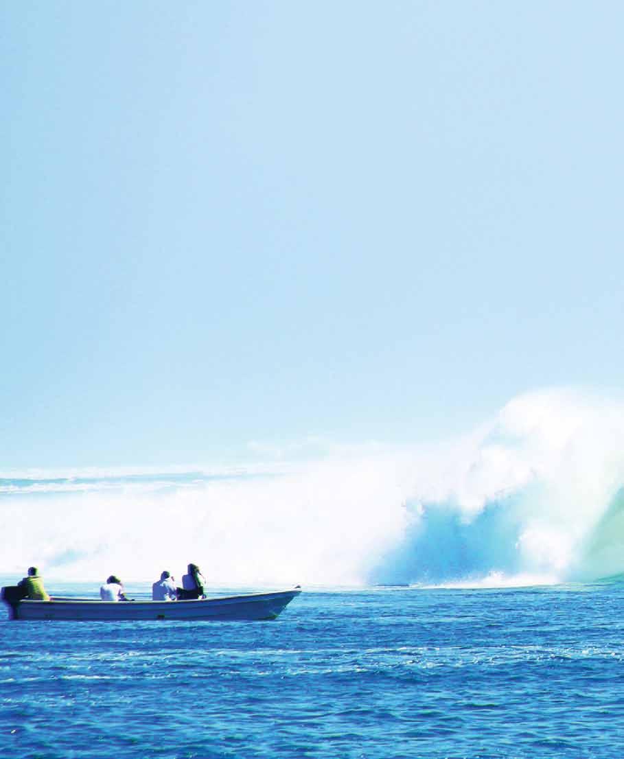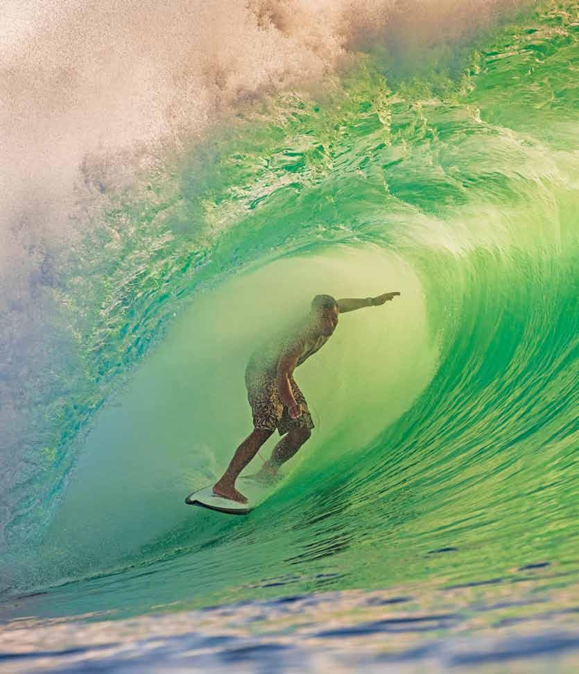 And that tube thing Adi Putra does. When the wave goes cylindrical and he stands up tall, front leg stiff, taking the weight and the momentum. Back leg deceptively active, on the gimbals of his ankle, controlling the torque and the drive. You just know he is going to come out of it cool. Not like some surfers where you hold your breath, hoping against hope that they are going to reappear. No, with Adi Putra it looks like fate and feels like a kind of magic that you look forward to fooling you. And you are so happy about it that you don’t even want to know how he does it. That’s the main thing. When you watch Adi Putra surf, whether at Halfway in Kuta, or Desert Point on Lombok, or Padang Padang on Bali, or Scar re ef on Sumbawa—anywhere really—the thing is that you just cannot help yourself from believing in the way he rides. Like watching your favorite actor. Except that Adi Putra is not an actor. He is very, very real. And here is where we get to what is below the iceberg. The unseen. You might see Adi Putra around, down at the end of his street on the beach in Kuta. Anywhere he sits, even on a plastic stool, he is always on the edge of it, spring-loaded, left knee going