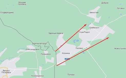 ще не знайшов геолокаційного підтвердження того, що РДК або ЛСР досягли Глотова чи Гори-Подолу. Геолокаційні кадри, опубліковані 22 травня, підтверджують, що РДК завдав удару по прикордонній заставі біля Козинки перед перетином кордону принаймні одним танком. РДК також опублікував кадри, на яких нібито видно тіло росій-