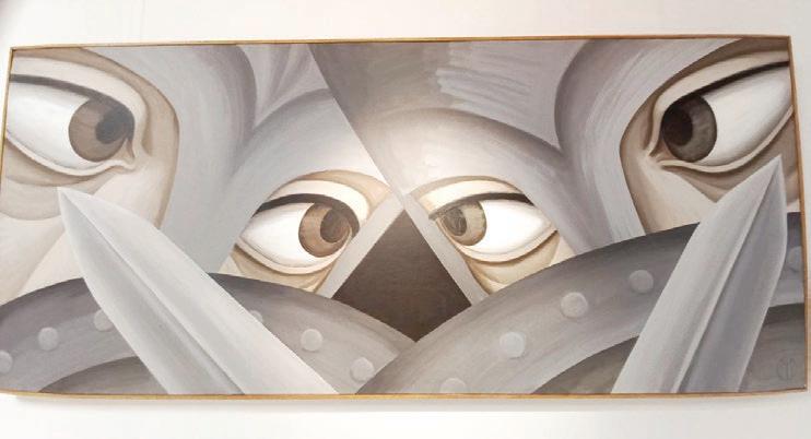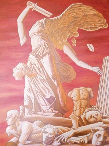 Роботу «Перемога» я написав до антивоєнної виставки 2023 року, що присвячувалась Міжнародному дню миру. То є постать Ніки Самофракійської з Лувру, а біля її постамента – обломки давньогрецької скульптури. Тут – питання руба: чи не є агресивність людини і до навколишнього світу, і до створінь свого роду причиною її божевільного просування до прірви самознищення? Чи можливо ту агресивність загасити, чи вона незнищенна? Наголос: свою мрію – «Земля без армій – планета розумних людей» – Олександр Мельник підкріплює, як