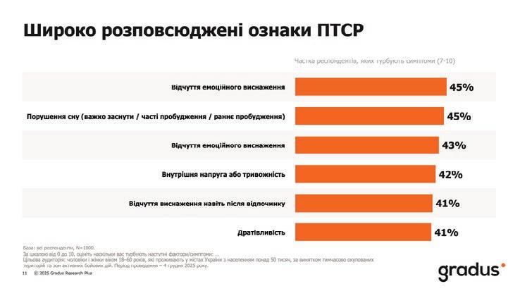 зують на довготривале перебування в стресі, зокрема відсутністю мотивації та зниженням продуктивності. Ознаки, що можуть свідчити про ПТСР, залишаються поширеними. Такі симптоми, як емоційне виснаження, порушення сну, тривожність і дратівливість, відзначають у себе від 41%