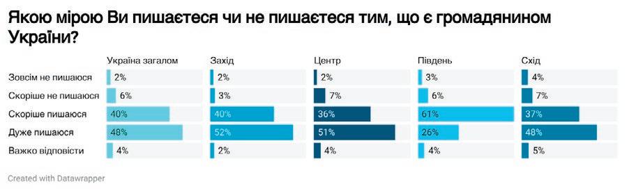 Сході України (84%). Однак саме на Сході кількість тих, хто пишається своїм громадянством, зросла з 2022 року з 76% до 84%. Матеріальне становище суттєво не впливає на відчуття гордості