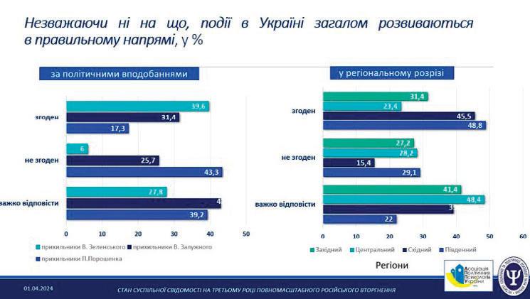 І нститут соціальної та політичної психології НАПН України спільно з Асоціацією політичних психологів України провели соціальне опитування щодо стану суспільної свідомості на третій рік повномасштабної війни росії проти України. Пропонуємо результати моніторингу громадської думки Аналіз регіональних відмінностей у громадській думці здійснюється на основі поєднання областей у чотири макрорегіони: Західний (Волинська, Закарпатська, Івано-Франківська, Львівська, Рівненська, Тернопільська, Чернівецька області); Центральний (Вінницька, Житомирська, Київська, Кіровоградська, Полтавська, Сумська, Хмельницька, Черкаська, Чернігівська області, м Київ); Східний (Дніпропетровська, Донецька, Запорізька, Луганська, Харківська області); Південний (Миколаївська, Одеська, Херсонська області). Також дані диференційовані за ознакою політичної прихильності респондентів на основі розподілу відповідей на запитання «Якби у зв ’ язку із закінченням повноважень чинного Президента було вирішено провести в Україні президентські вибори і на них балотувалися перелі-