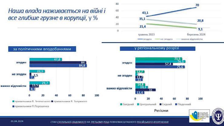 корупції. Нині 70% респондентів погоджуються з тим, що влада наживається на війні і все глибше грузне в корупції Рік тому таку думку поділяли лише 43% опитаних Менш критично налаштовані до влади у цьому питанні мешканці Сходу (57,5% погоджуються з наведеним твердженням) і прихильники В. Зеленського (47,8%).