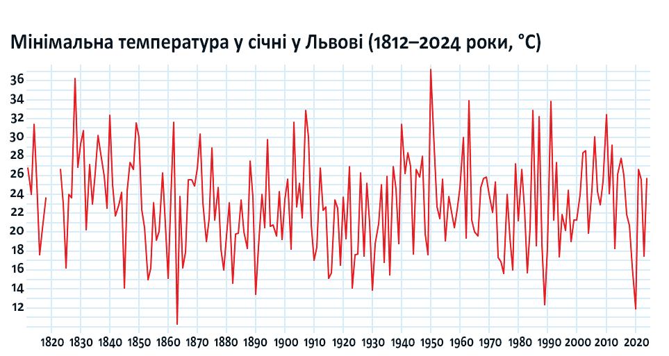 температуру у Львові за весь час спостережень було зафіксовано саме у січні: між 8-ою а 9-ою годиною ранку 12-го числа 1950 року термометр показував -33,7°; в поточному столітті цей