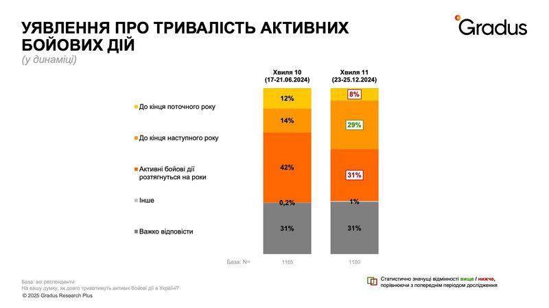 У 2025 РОЦІ Наразі 53% респондентів абсолютно чи радше впевнені, що Україна здатна відбити напад російської федерації. Під впливом риторики новообраного президента США, спостерігаємо значне підвищення очікувань завершення війни до кінця 2025 року. 26% респондентів в 2024 вважали, що війна завершиться до кінця