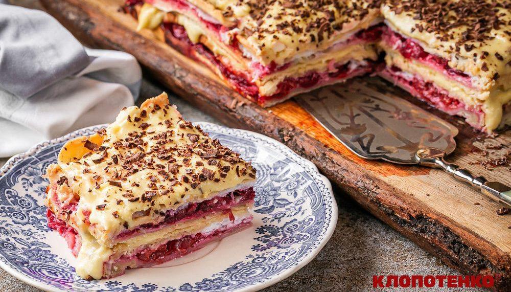 Цей пляцок під назвою «Зимова вишня» має чотири шари тоненького тіста, два шари білкового крему, ніжний масляно-жовтковий крем та два шари соковитих вишеньок.