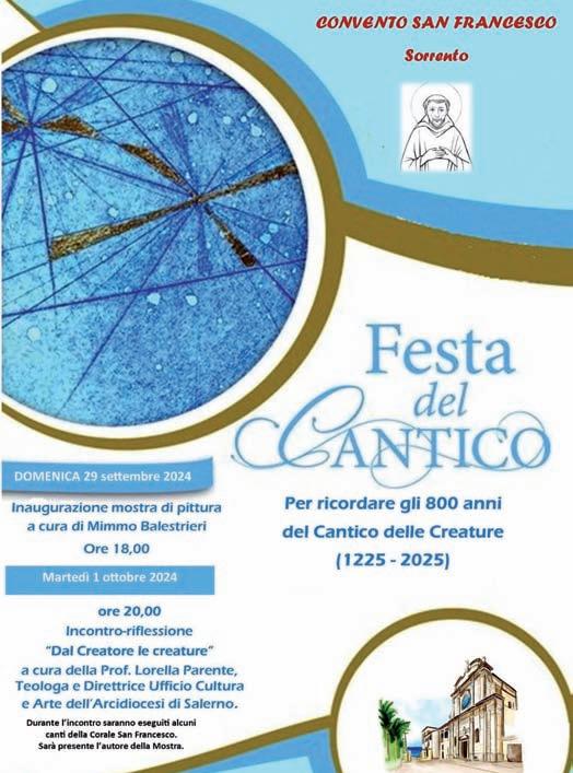 Alle ore 19,30 del 1° ottobre, si terrà un Incontro-riflessione “Dal Creatore le creature” a cura della Prof. Lorella Parente, teologa e Direttore Ufficio Cultura e Arte dell’Arcidiocesi di Salerno. Saranno presenti la Corale San Francesco diretta dal M° Rosanna Frasso ed il pittore Mimmo Balestrieri.