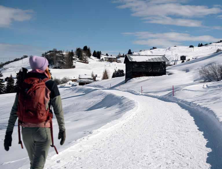 3 Surcuolm / Bündner Rigi Für fortgeschrittene Geniesser. Der markierte Schneeschuhtrail bietet alles, was eine grossartige Tagestour bieten sollte: Viel unberührte Winterlandschaften und Weitblicke. Sie kann in Cuolm Sura und dem Bündner Rigi kulinarisch aufgewertet werden. Die Route sollte bei grosser Lawinengefahr nicht unternommen werden.