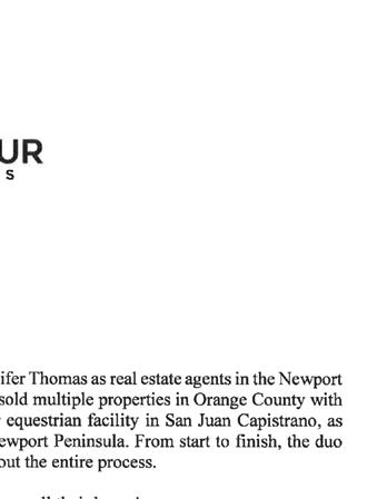 Jennifer Thomas is a standout figure in the luxury real estate industry, leaving an enduring impact on Orange County through her unwavering work ethic and commitment to unparalleled client service. A graduate of University of Southern California’s Marshall School of Business, Jennifer holds a dual degree in Business Administration with an emphasis on Real Estate Finance and Marketing. Her genuinely ethical and friendly nature instills a spirit of trust and integrity in her business transactions and personal dealings. Recognized for her superior dedication to her clients, passion for real estate, impeccable sales techniques, and tireless marketing tactics, Jennifer has become well-known as a reliable, efficient, and successful agent in the industry.