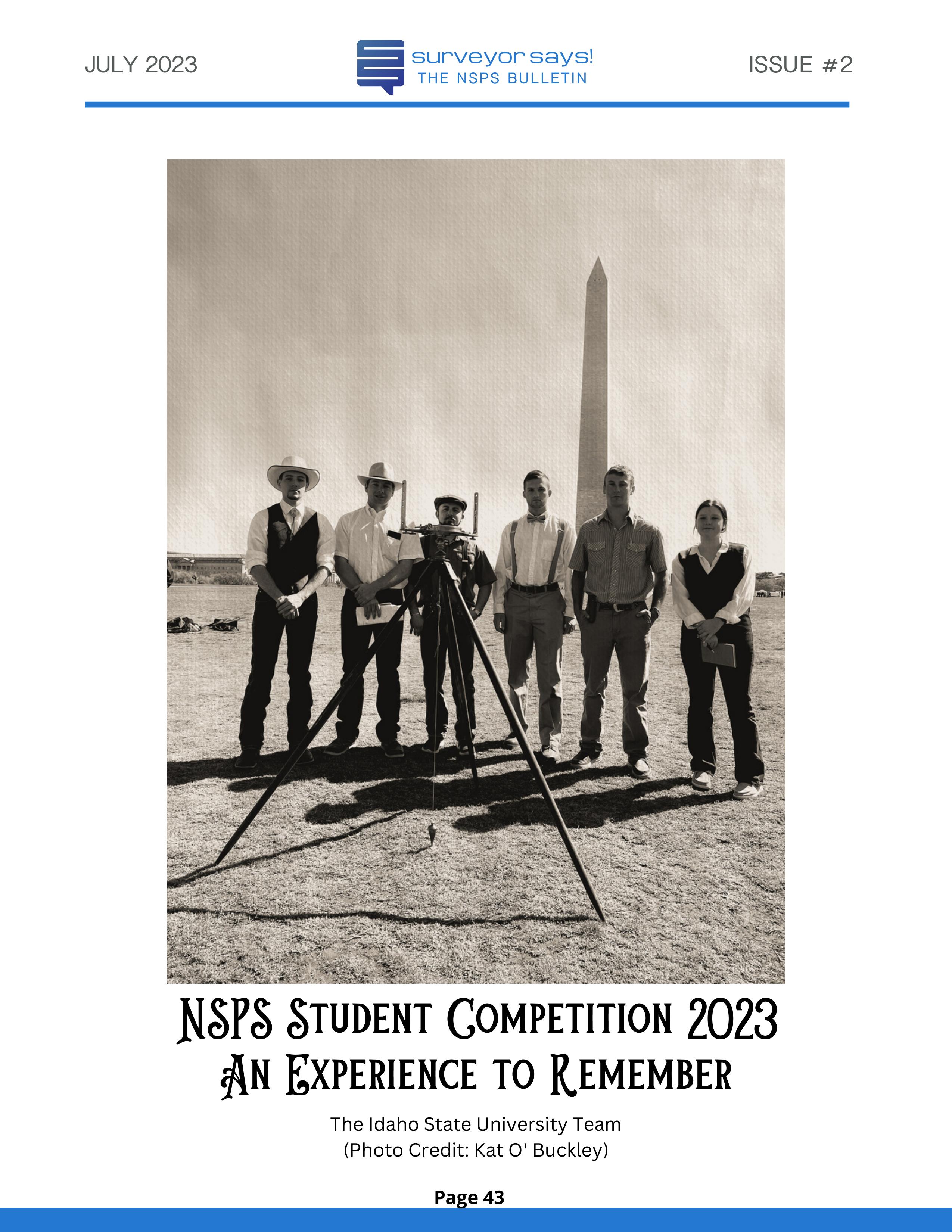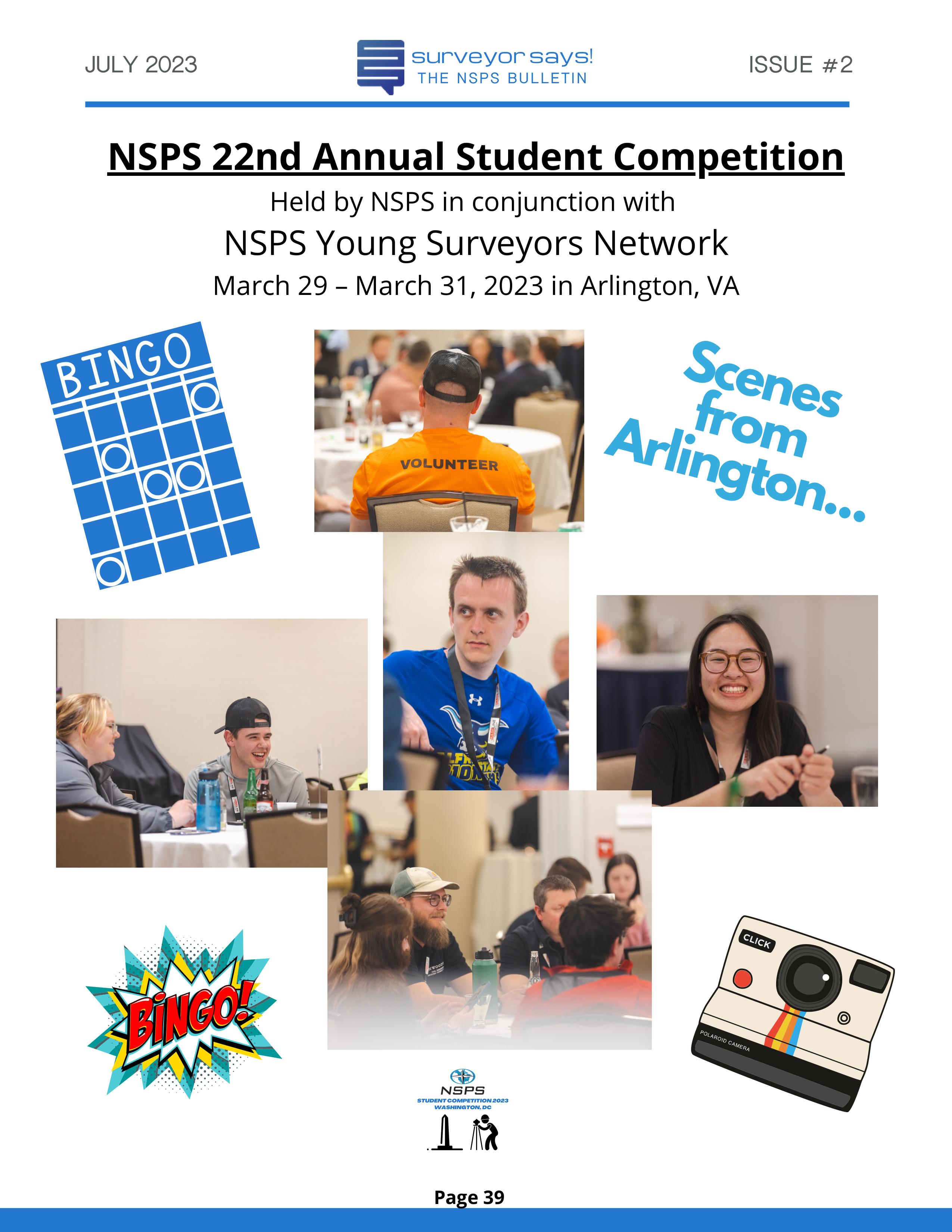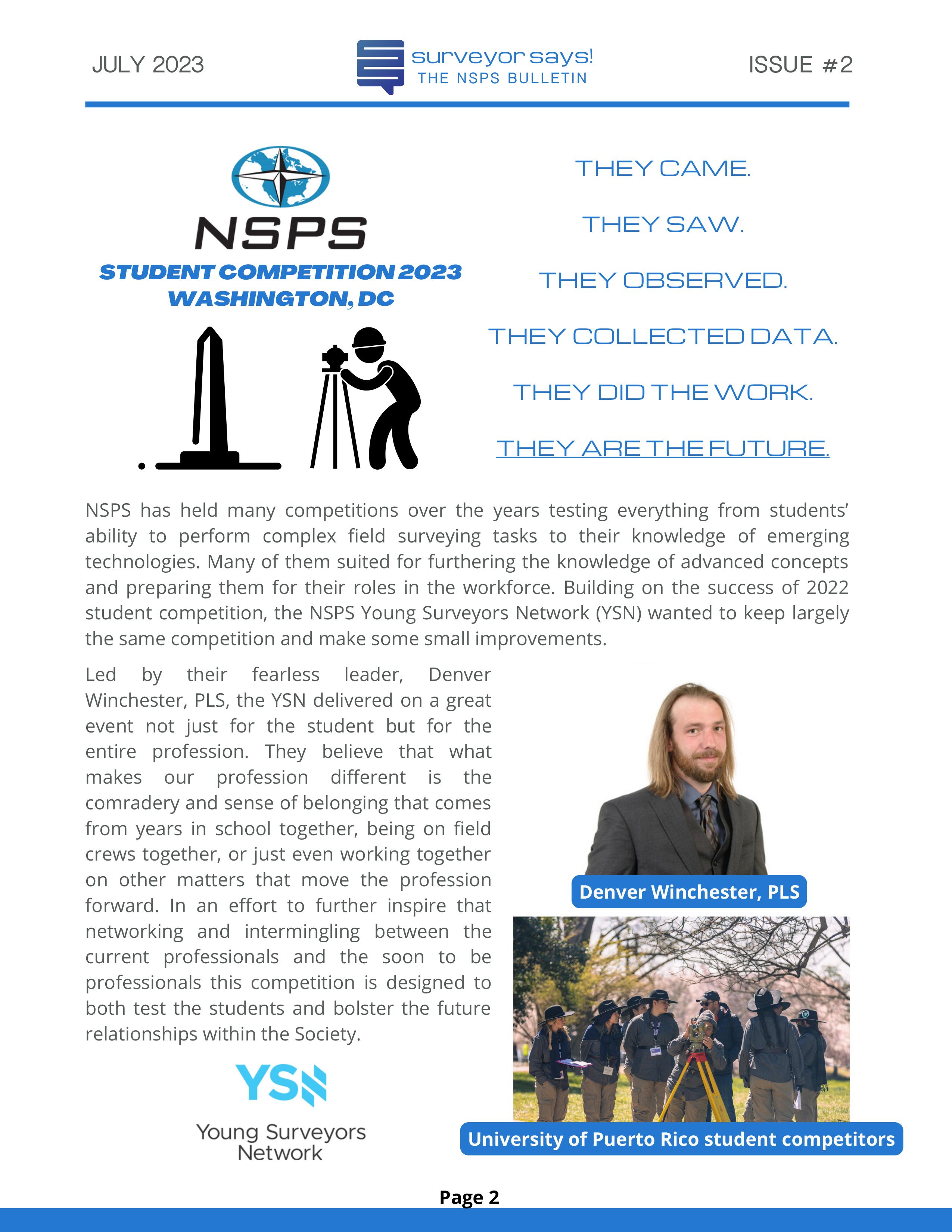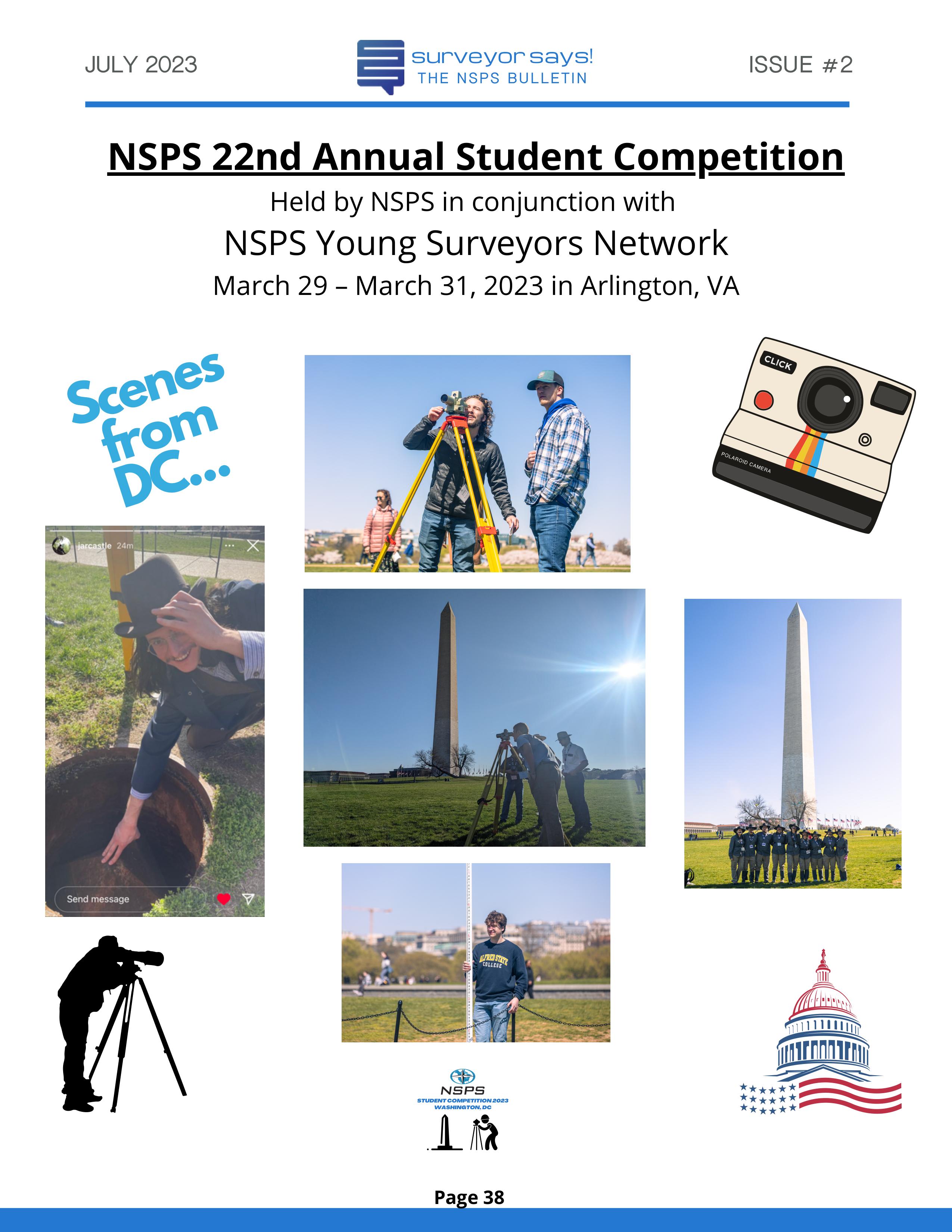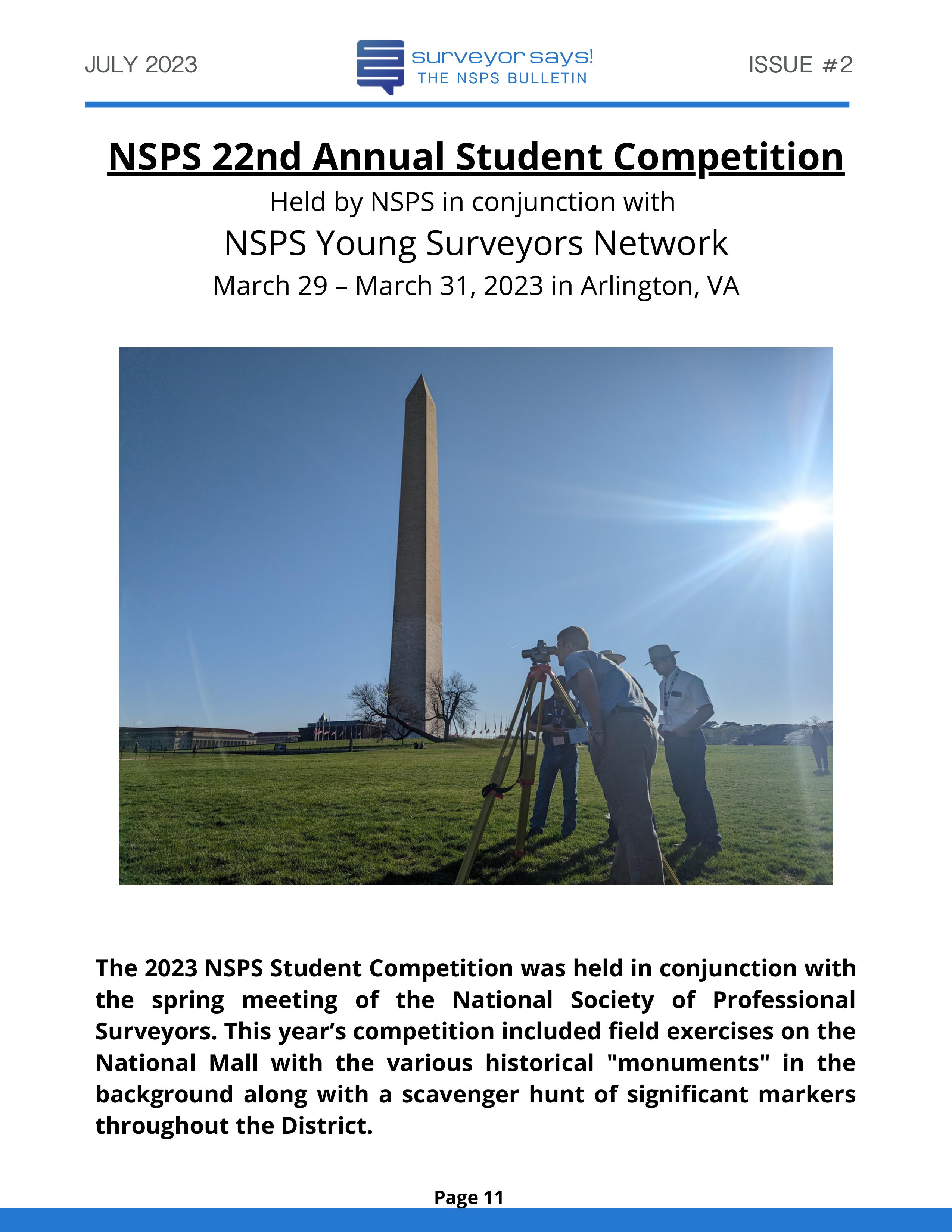 Welcome to "Surveyor Says! The NSPS Bulletin" covering this year's National Student Competition held in Washington, DC during the Spring Business Meeting on March 29-31, 2023. The edition features all of the teams who competed (24, up from 11 in 2022!) and highlights the activities encompassing this year's competition. Fun was had by all, so check it out and feel free to share!