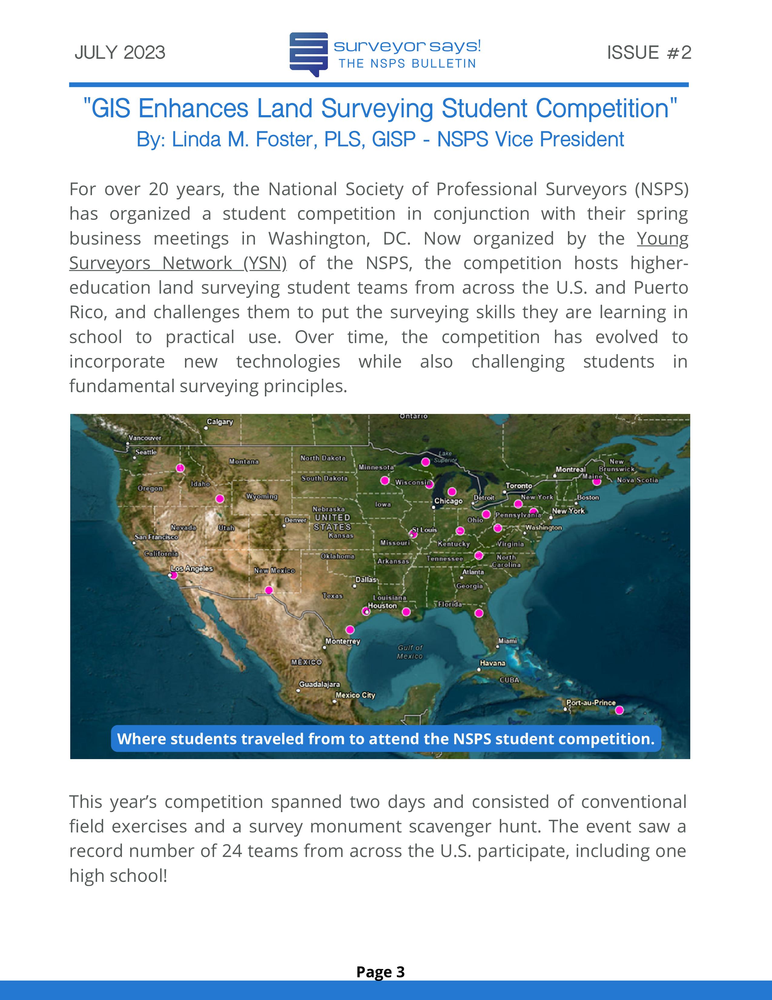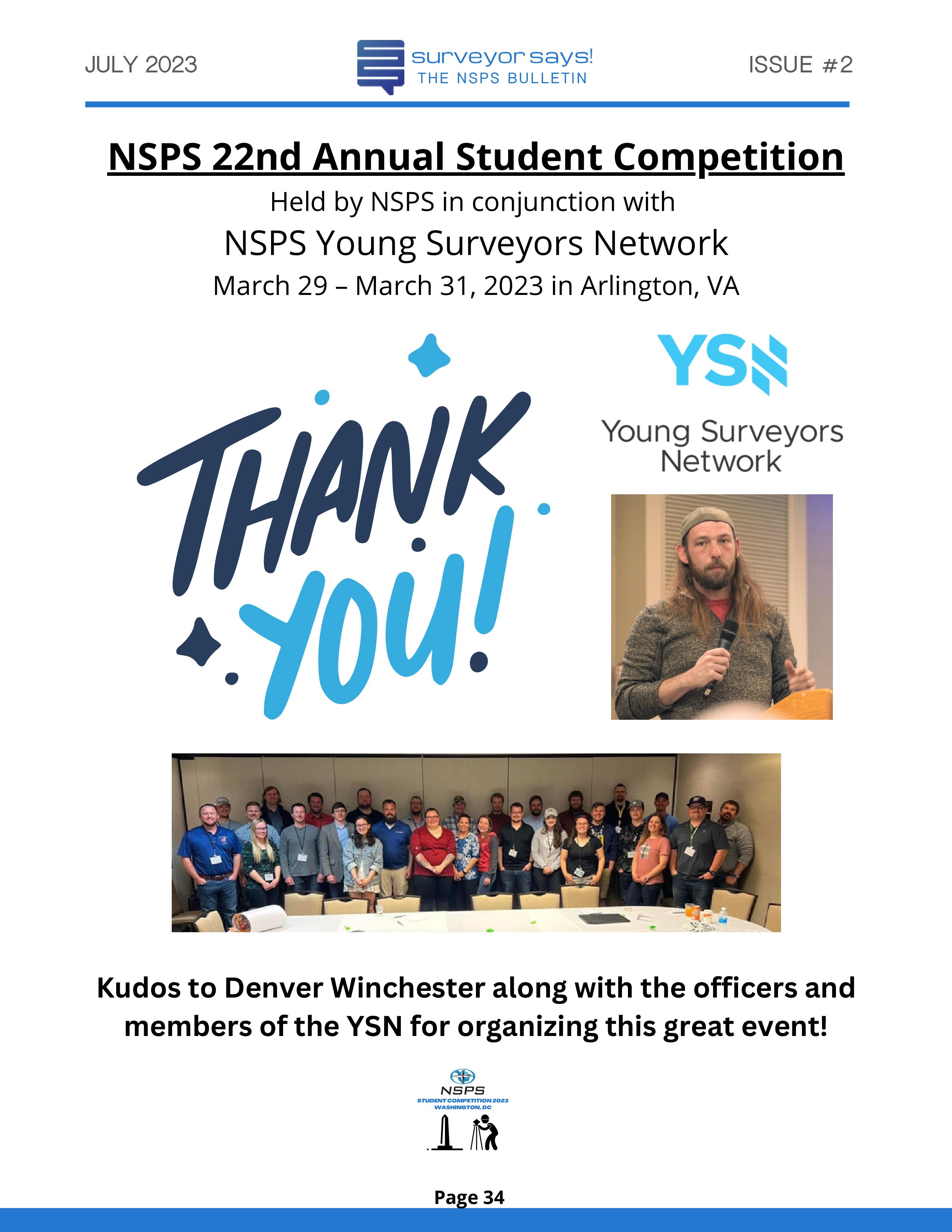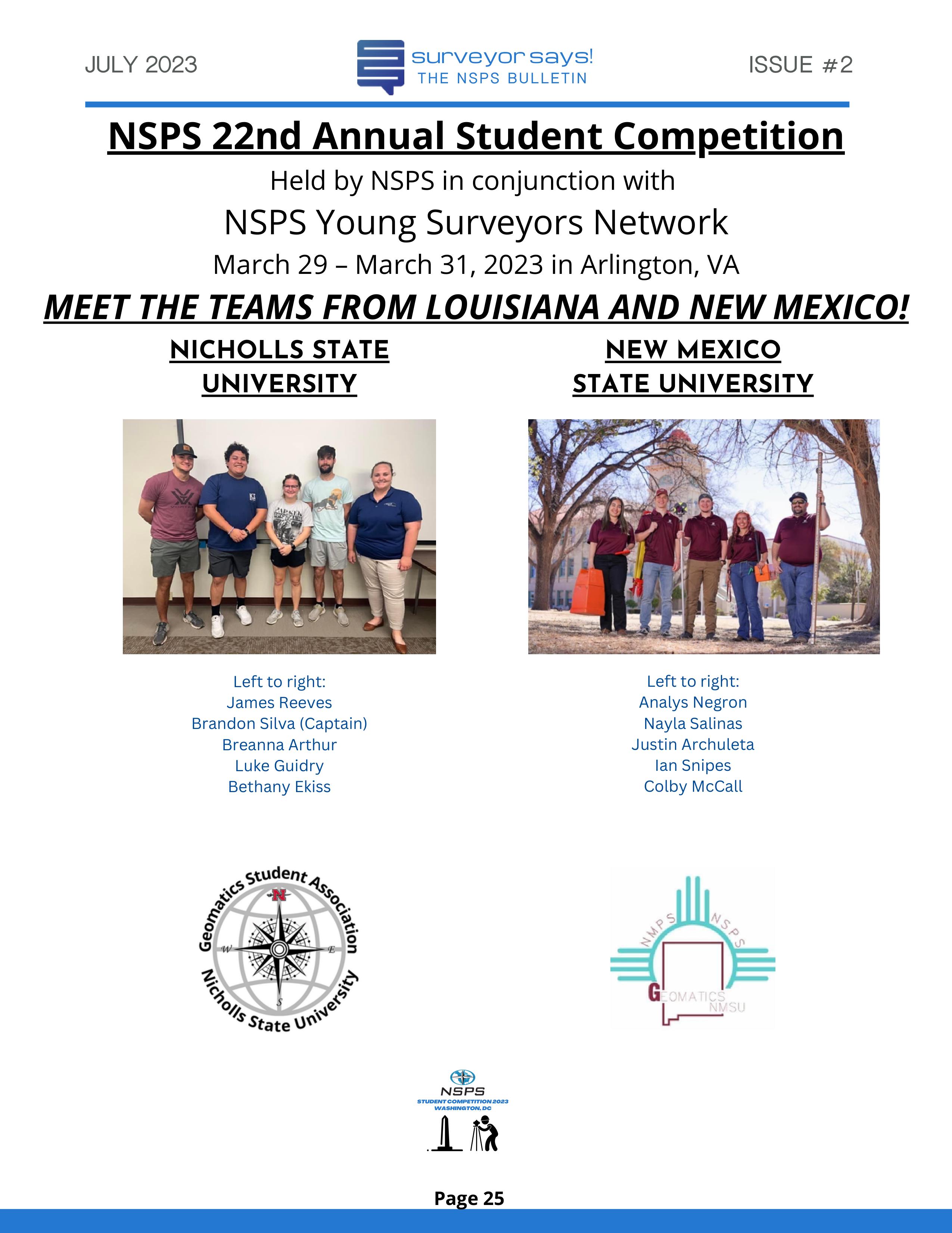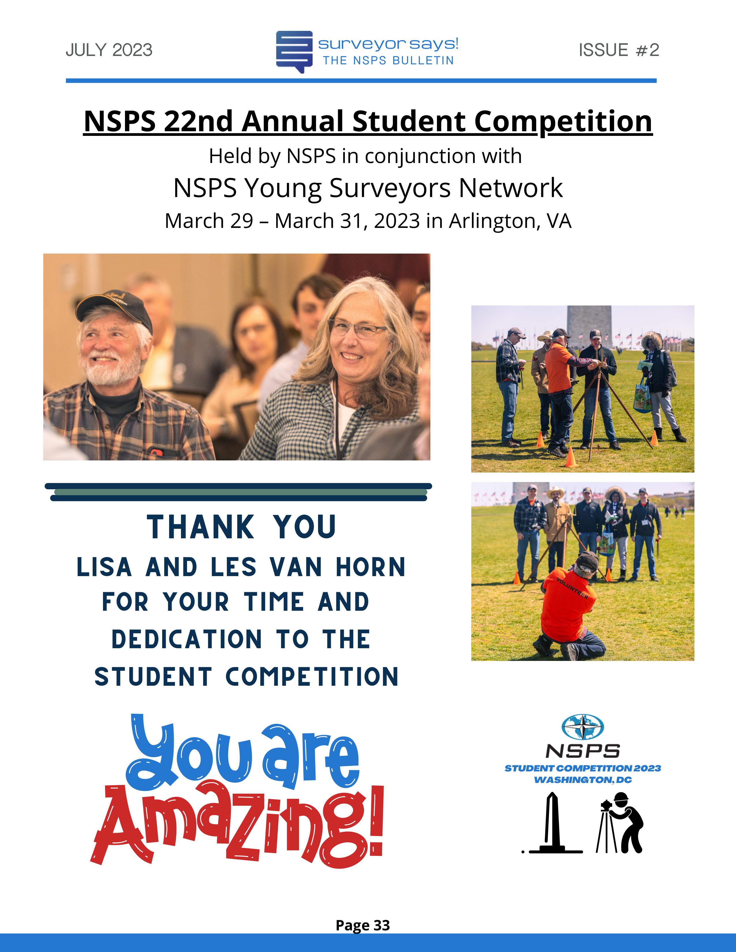 Welcome to "Surveyor Says! The NSPS Bulletin" covering this year's National Student Competition held in Washington, DC during the Spring Business Meeting on March 29-31, 2023. The edition features all of the teams who competed (24, up from 11 in 2022!) and highlights the activities encompassing this year's competition. Fun was had by all, so check it out and feel free to share!