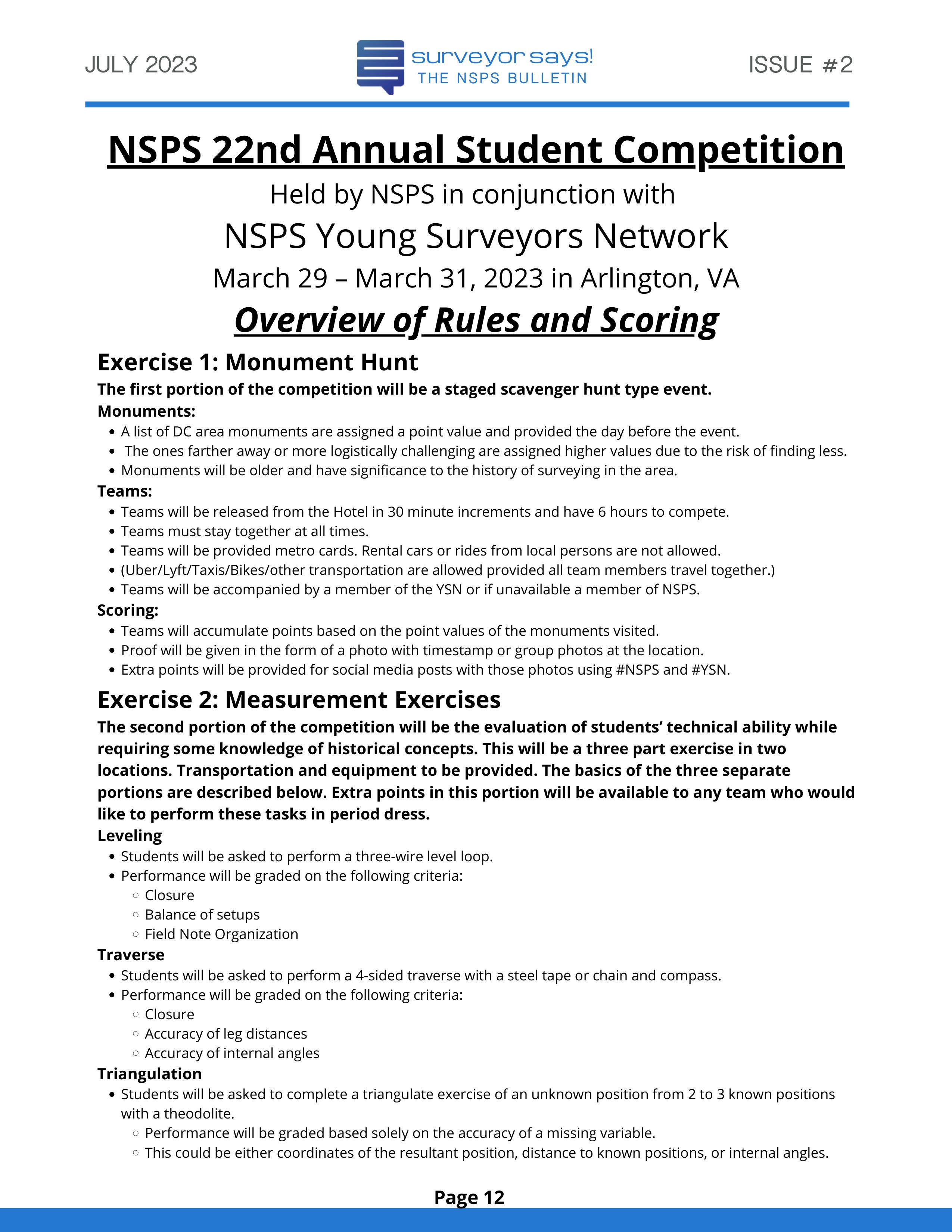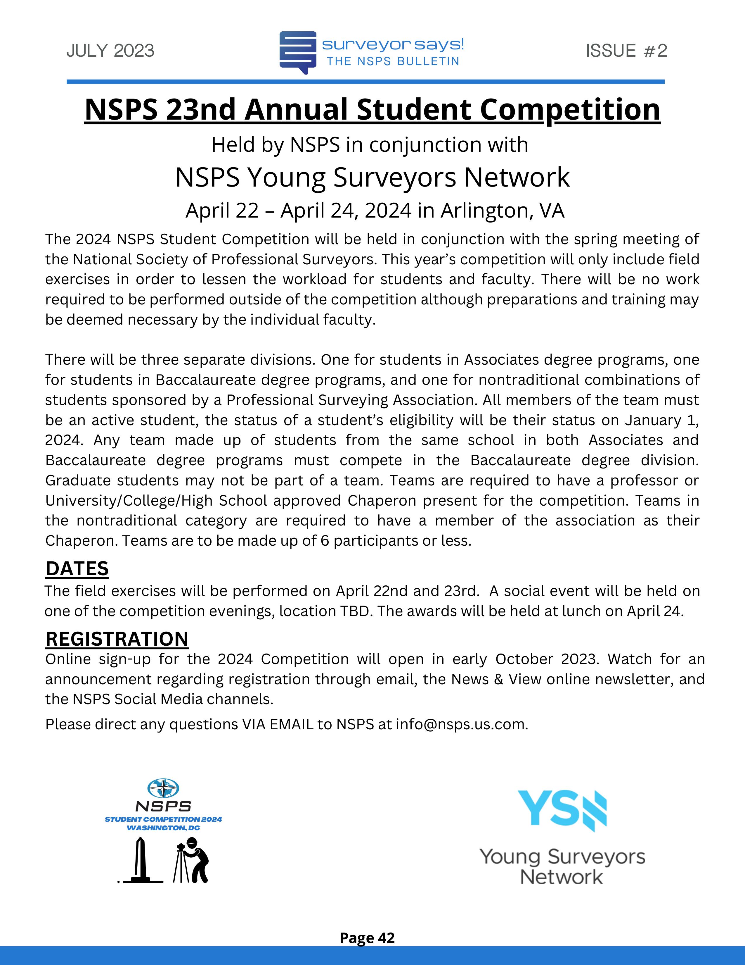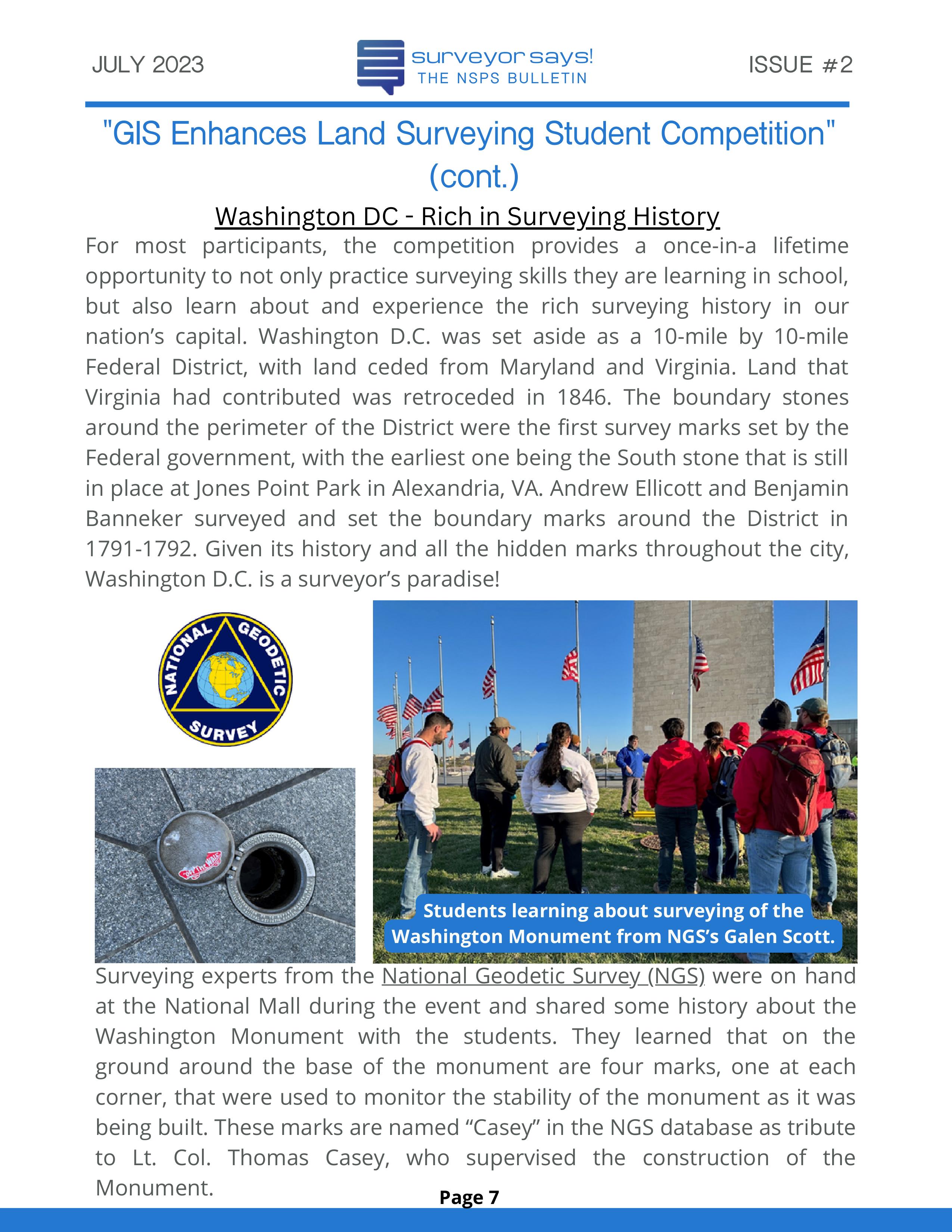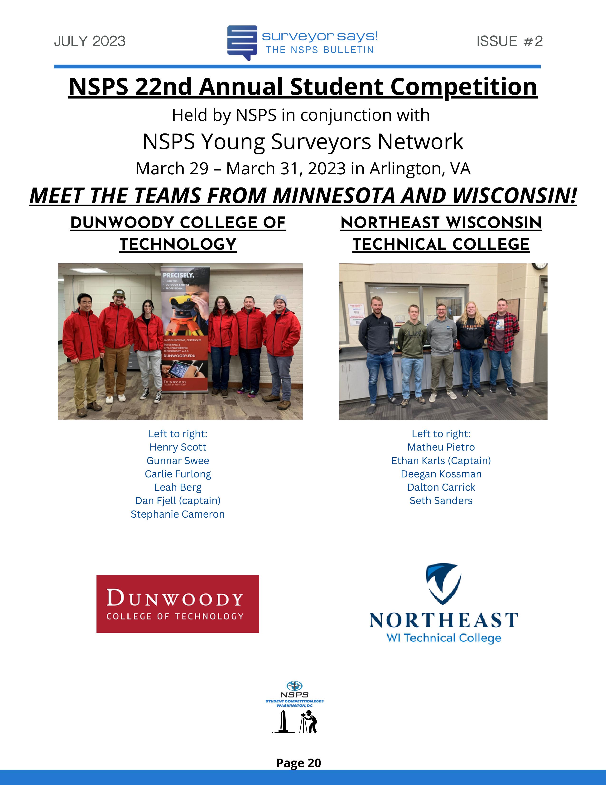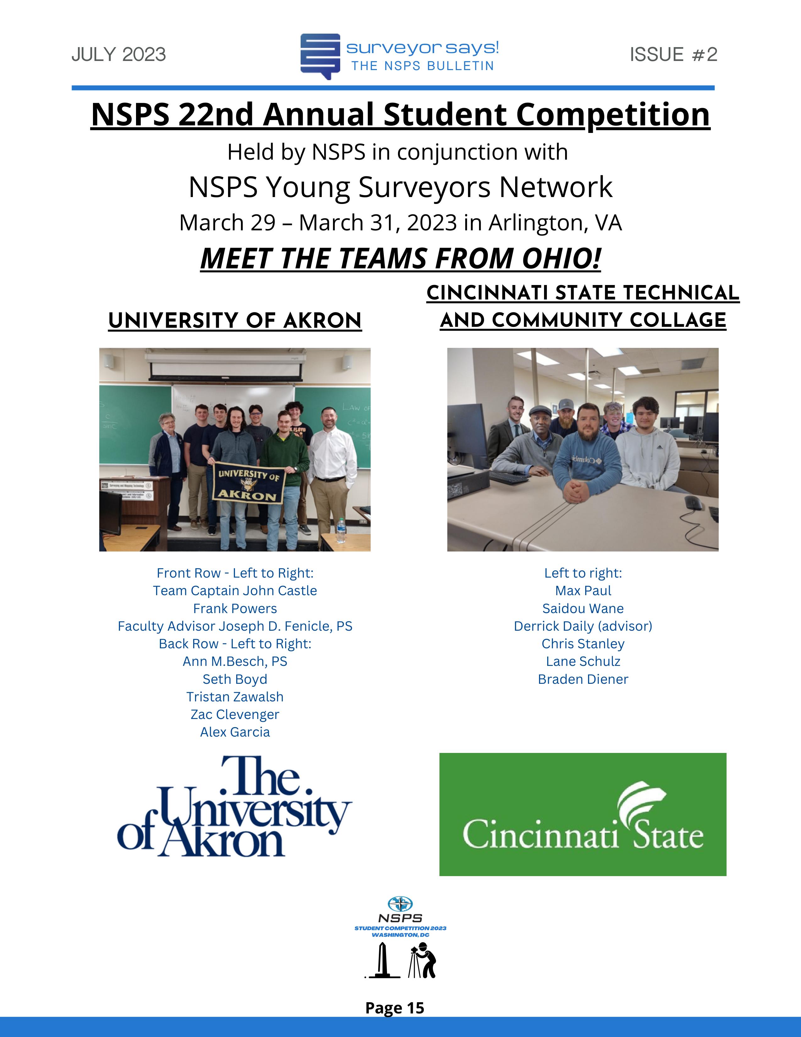 Welcome to "Surveyor Says! The NSPS Bulletin" covering this year's National Student Competition held in Washington, DC during the Spring Business Meeting on March 29-31, 2023. The edition features all of the teams who competed (24, up from 11 in 2022!) and highlights the activities encompassing this year's competition. Fun was had by all, so check it out and feel free to share!