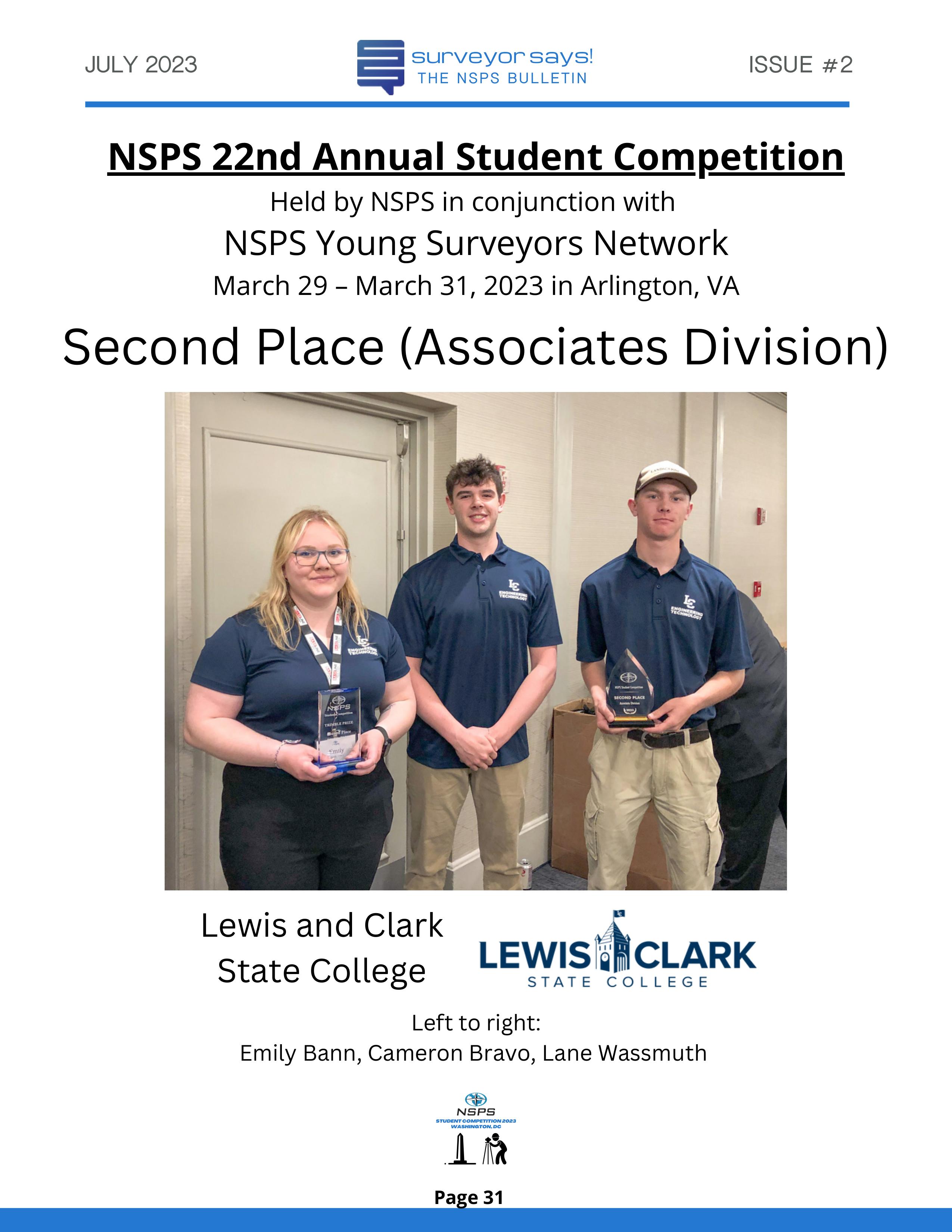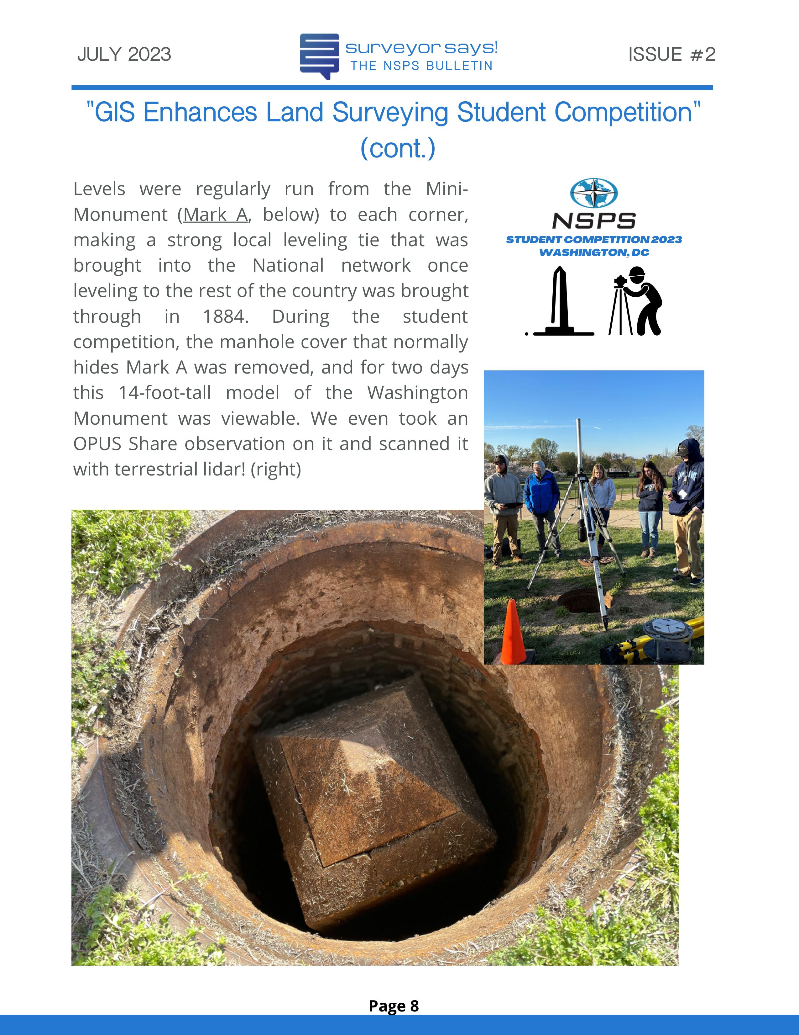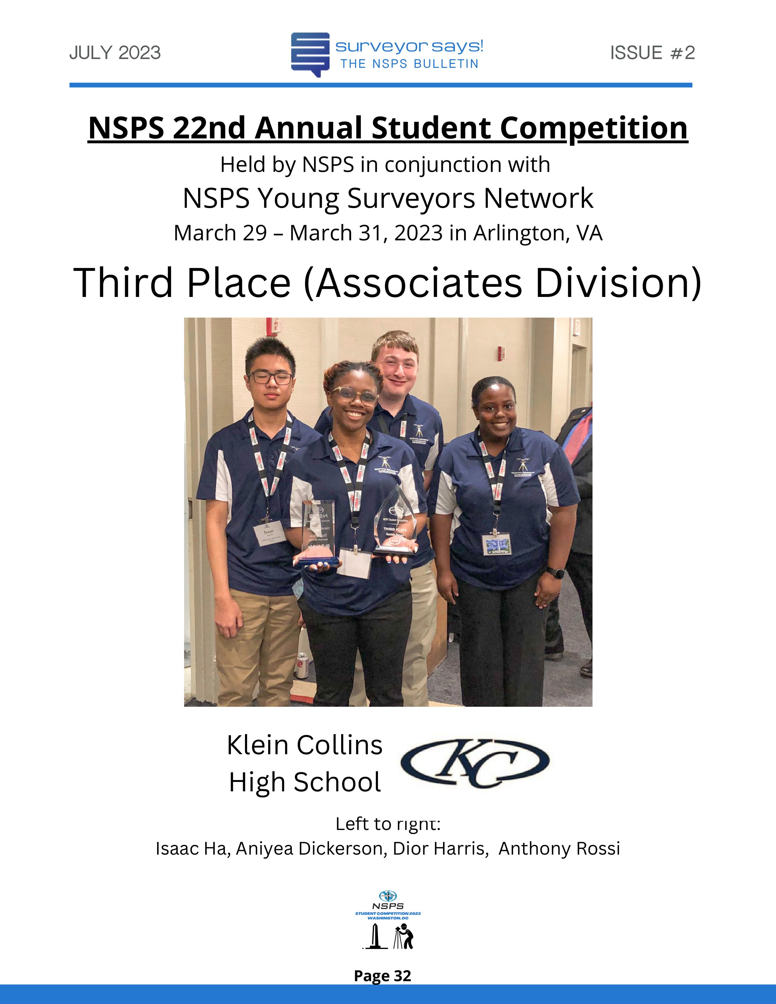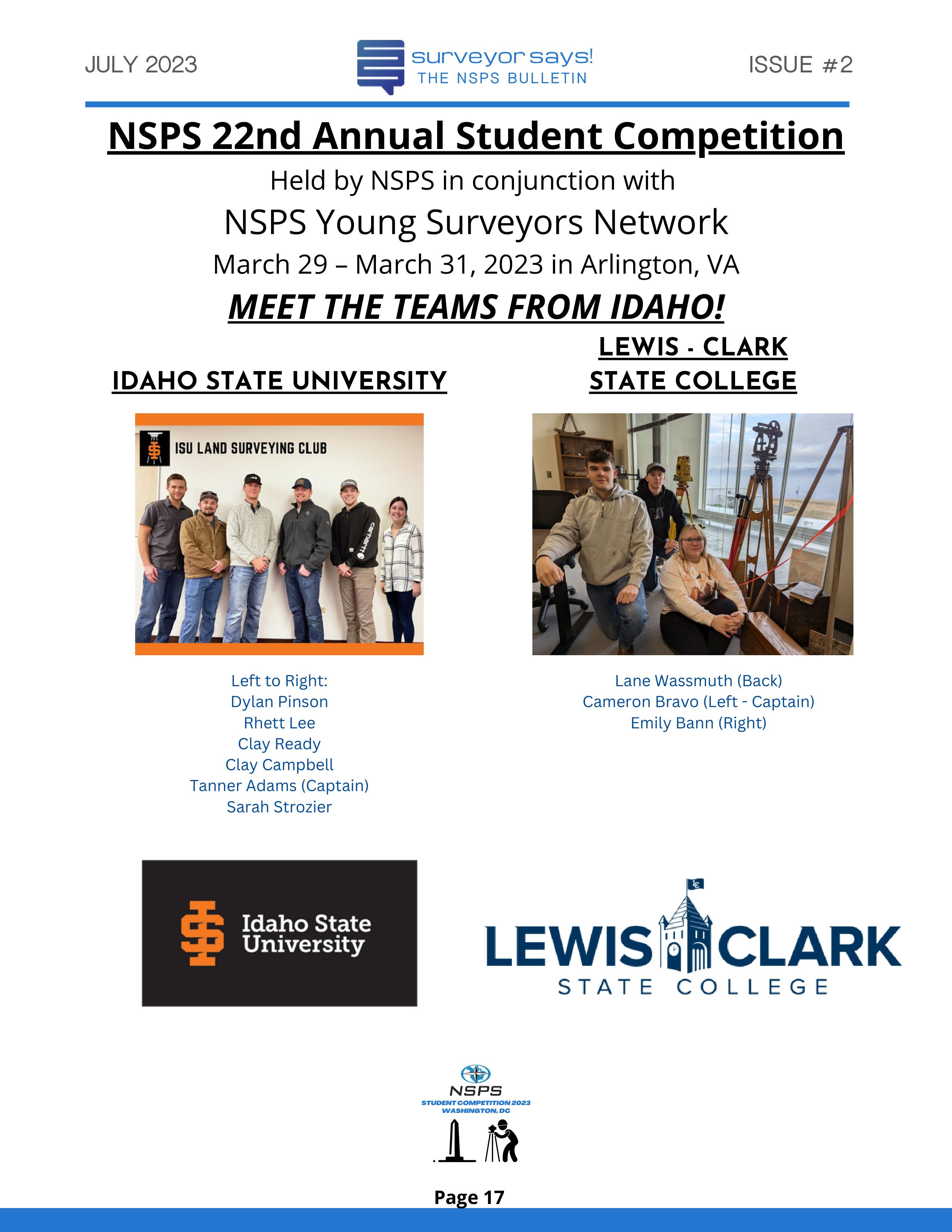 Welcome to "Surveyor Says! The NSPS Bulletin" covering this year's National Student Competition held in Washington, DC during the Spring Business Meeting on March 29-31, 2023. The edition features all of the teams who competed (24, up from 11 in 2022!) and highlights the activities encompassing this year's competition. Fun was had by all, so check it out and feel free to share!