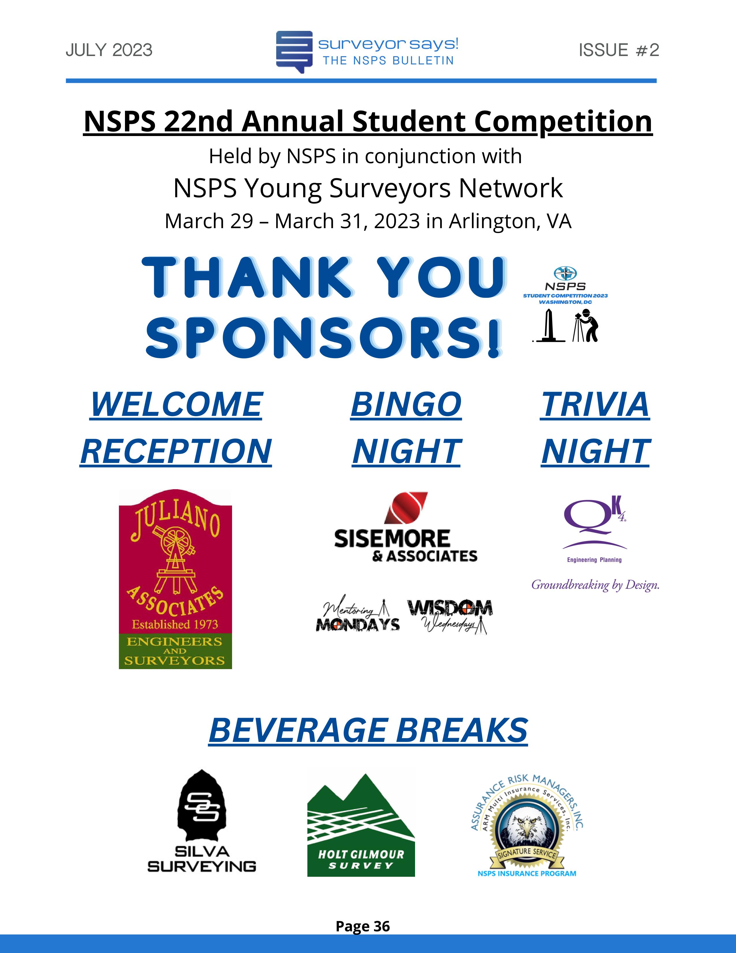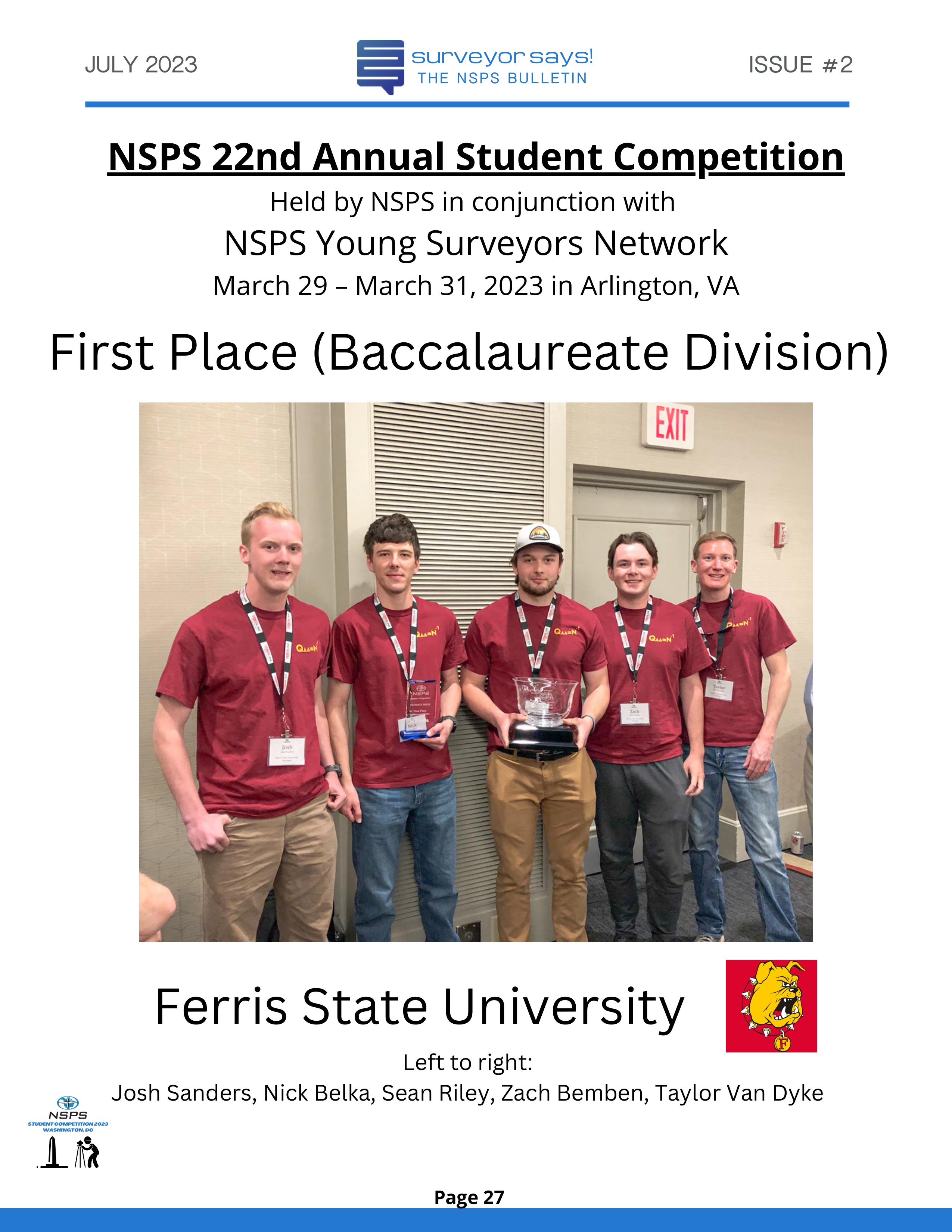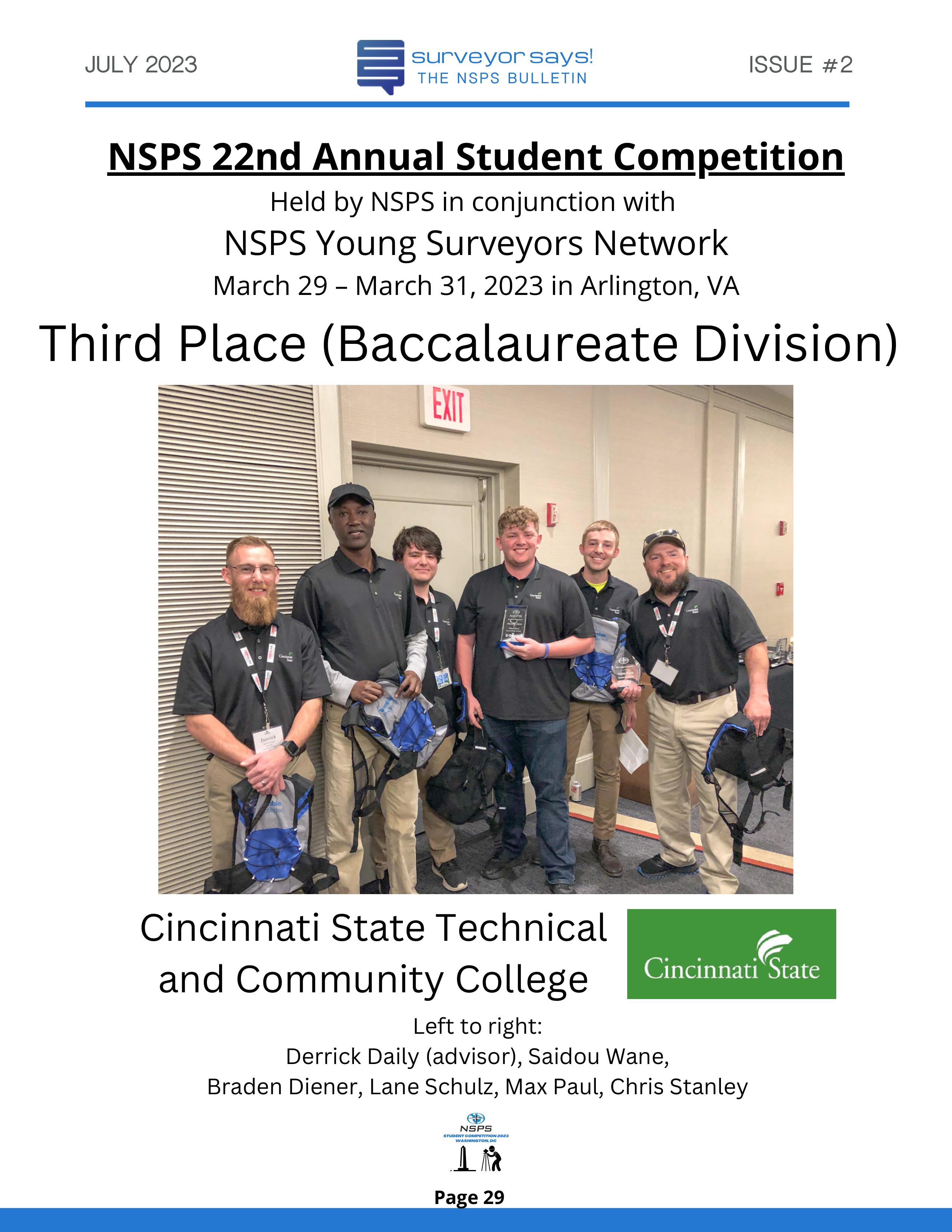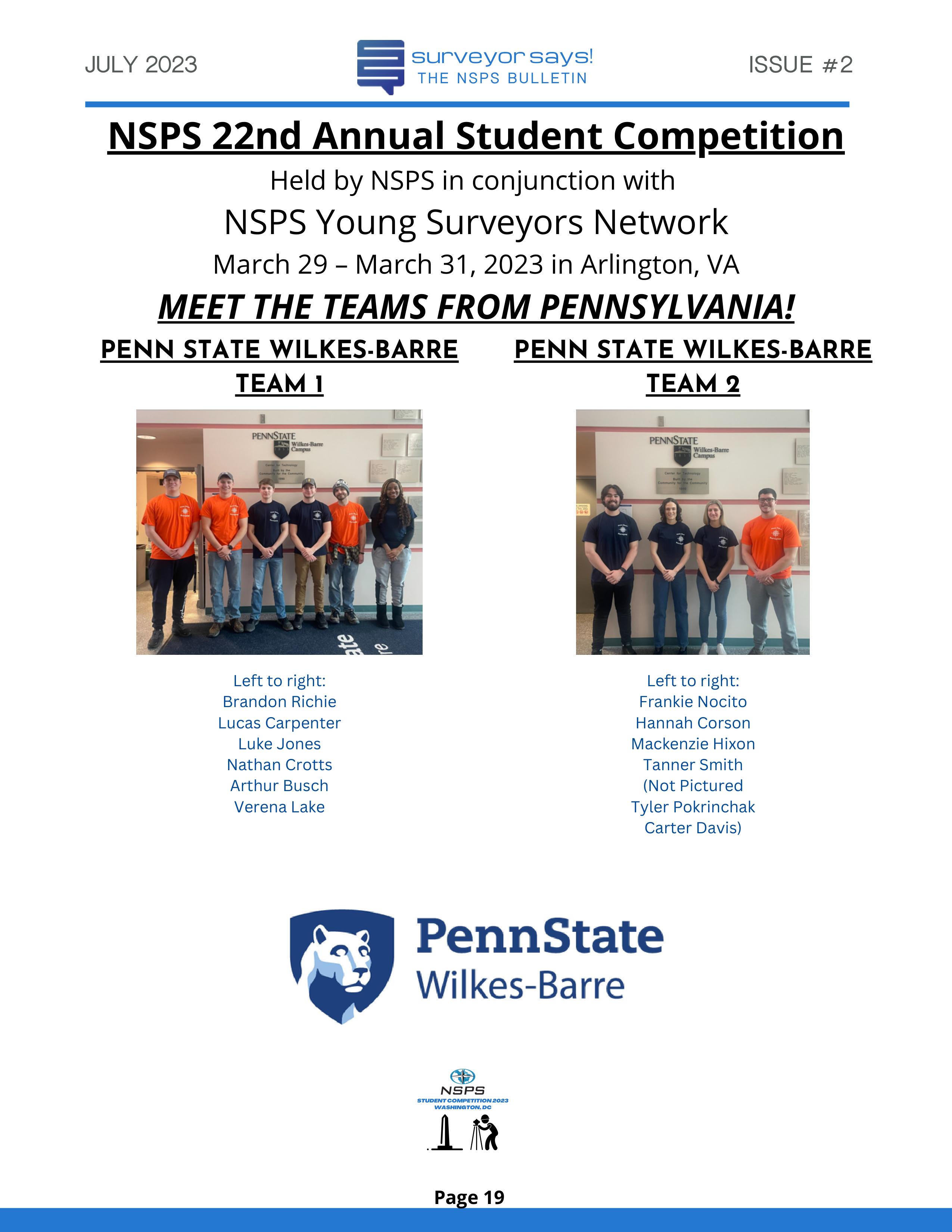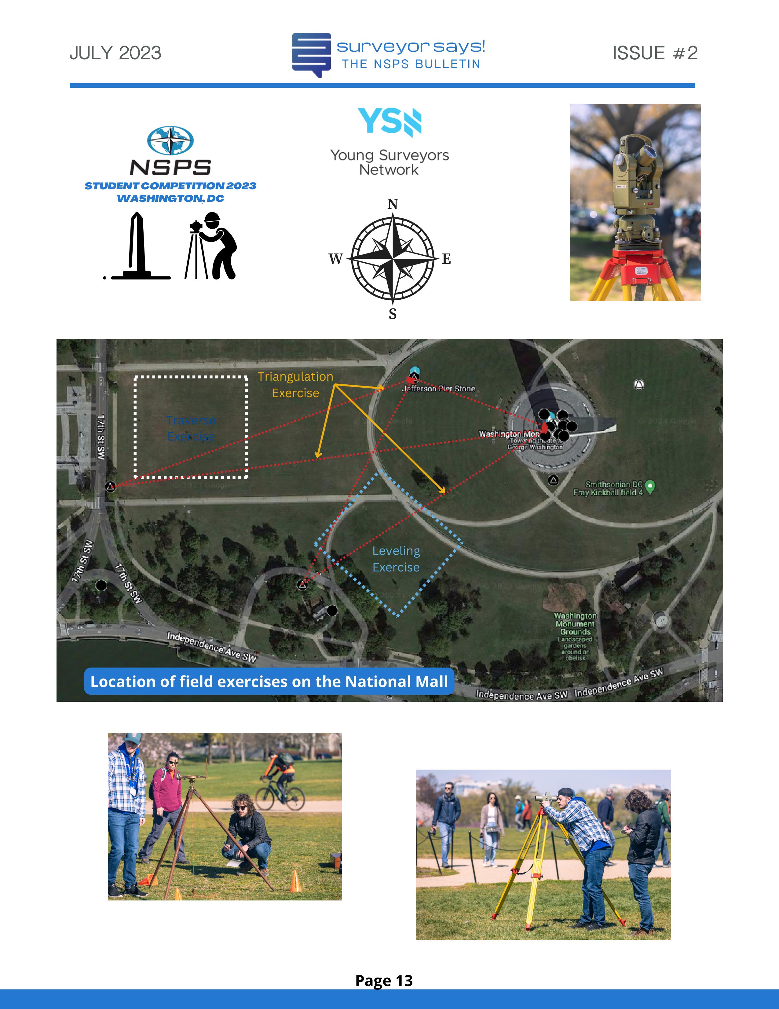 Welcome to "Surveyor Says! The NSPS Bulletin" covering this year's National Student Competition held in Washington, DC during the Spring Business Meeting on March 29-31, 2023. The edition features all of the teams who competed (24, up from 11 in 2022!) and highlights the activities encompassing this year's competition. Fun was had by all, so check it out and feel free to share!