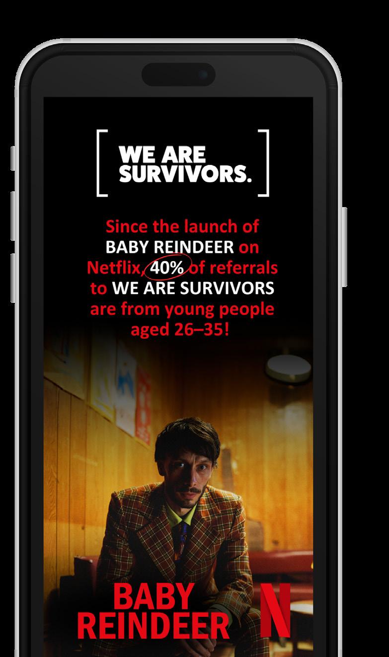 remind myself of the positive impact this is having. The widespread feeling online is that Baby Reindeer is a moving show that’s making people think about and understand certain themes - like abuse, like stalking. And then of course, the most positive thing to come out of is the effect on We Are Survivors - the referrals. The statistics from We Are Survivors were very very moving for me to read. A 200% increase in emails, 53% of new referrals cite Baby Reindeer. I hear it’s the number one topic of conversation in in the meeting rooms and therapy sessions, and a lot of young people are coming forward as well, and that is really lovely to hear. I’ll continue to embrace you and we’re always looking at what we can do. You guys have got me through some difficult times, so I wouldn’t do it if I didn’t think you were a life-changing, amazing organisation.